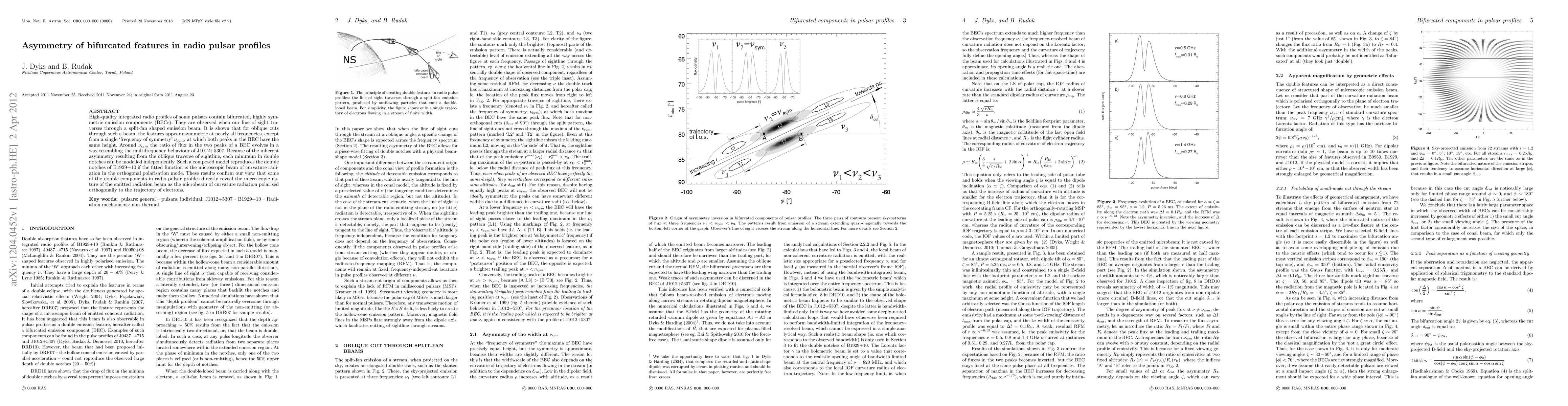 The study reveals that certain features in pulsar radio signals, called bifurcated emission components, appear asymmetric due to the way our line of sight cuts through their emission beam, with a unique frequency where these features become symmetric. This behavior supports the idea that these signals originate from microscopic curvature radiation beams, providing insight into the fundamental emission processes of pulsars.