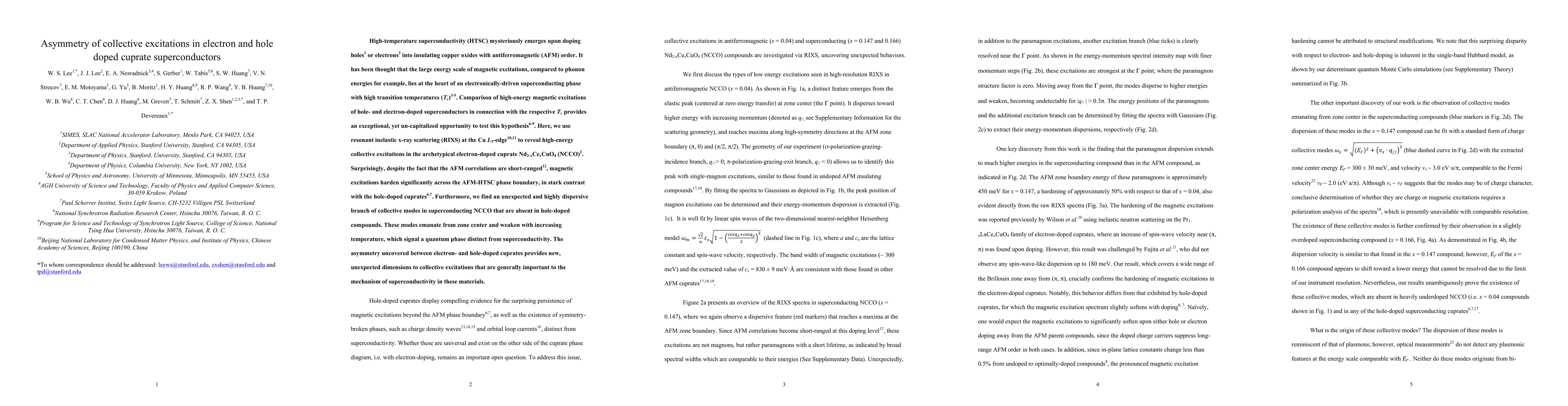 The study reveals significant differences in high-energy magnetic excitations between hole- and electron-doped cuprate superconductors using RIXS, showing that magnetic excitations harden in electron-doped systems but not in hole-doped ones. An unexpected dispersive mode in electron-doped Nd2-xCeCuO4 hints at a distinct quantum phase beyond superconductivity.