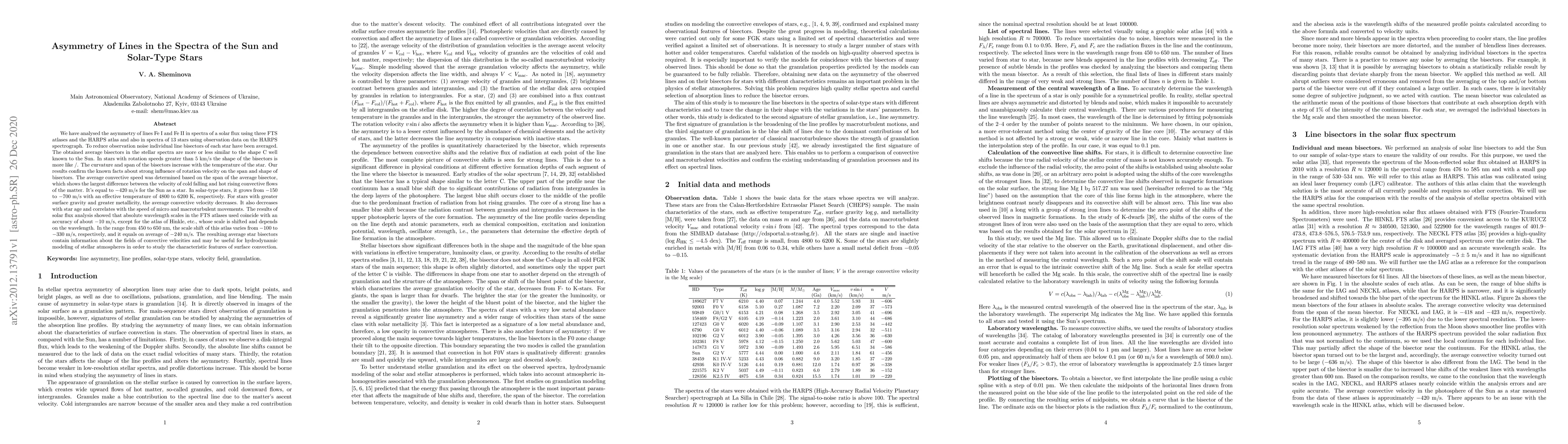 We have analysed the asymmetry of lines Fe I and Fe II in spectra of a solar flux using three FTS atlases and the HARPS atlas and also in spectra of 13 stars using observation data on the HARPS spectrograph. To reduce observation noise individual line bisectors of each star have been averaged. The obtained average bisectors in the stellar spectra are more or less similar to the shape C well known to the Sun. In stars with rotation speeds greater than 5 km/s the shape of the bisectors is more like /. The curvature and span of the bisectors increase with the temperature of the star. Our results confirm the known facts about strong influence of rotation velocity on the span and shape of bisectors. The average convective speed was determined based on the span of the average bisector, which shows the largest difference between the velocity of cold falling and hot rising convective flows of the matter. It's equal to -420 m/s for the Sun as a star. In solar-type stars, it grows from -150 to -700 m/s with an effective temperature of 4800 to 6200 K, respectively. For stars with greater surface gravity and greater metallicity, the average convective velocity decreases. It also decreases with star age and correlates with the speed of micro and macroturbulent movements. The results of solar flux analysis showed that absolute wavelength scales in the FTS atlases used coincide with an accuracy of about -10 m/s, except for the atlas of Hinkle, etc., whose scale is shifted and depends on the wavelength. In the range from 450 to 650 nm, the scale shift of this atlas varies from -100 to -330 m/s, respectively, and it equals on average of -240 m/s. The resulting average star bisectors contain information about the fields of convective velocities and may be useful for hydrodynamic modeling of stellar atmospheres in order to study the characteristic features of surface convection.