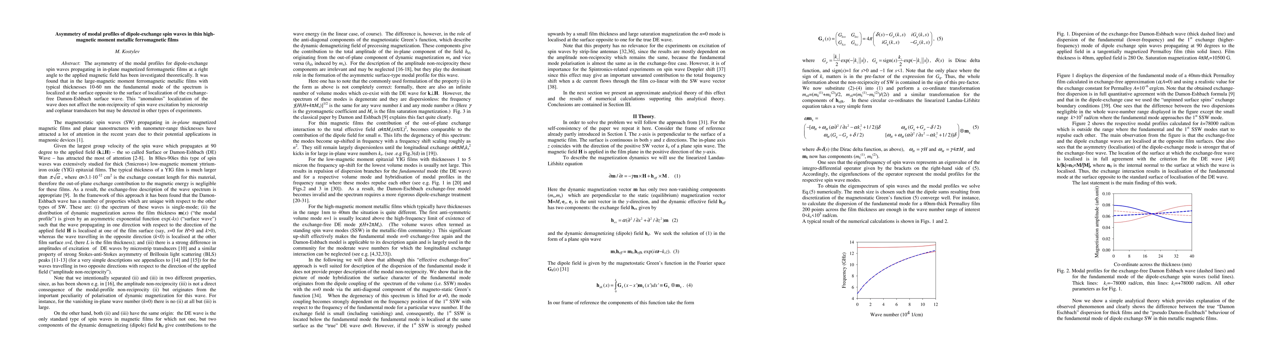 This paper investigates the asymmetry of dipole-exchange spin waves in thin ferromagnetic films, finding that the fundamental mode is localized at the surface opposite to the Damon-Eshbach wave. This localization does not impact spin wave excitation non-reciprocity but may be detectable in alternative experimental setups.