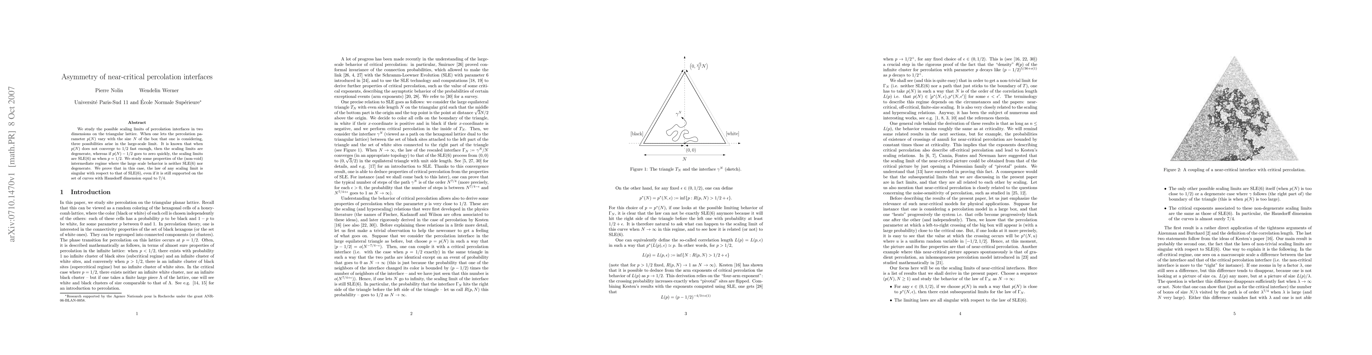 We study the possible scaling limits of percolation interfaces in two dimensions on the triangular lattice. When one lets the percolation parameter p(N) vary with the size N of the box that one is considering, three possibilities arise in the large-scale limit. It is known that when p(N) does not converge to 1/2 fast enough, then the scaling limits are degenerate, whereas if p(N) - 1 / 2 goes to zero quickly, the scaling limits are SLE(6) as when p=1/2. We study some properties of the (non-void) intermediate regime where the large scale behavior is neither SLE(6) nor degenerate. We prove that in this case, the law of any scaling limit is singular with respect to that of SLE(6), even if it is still supported on the set of curves with Hausdorff dimension equal to 7/4.