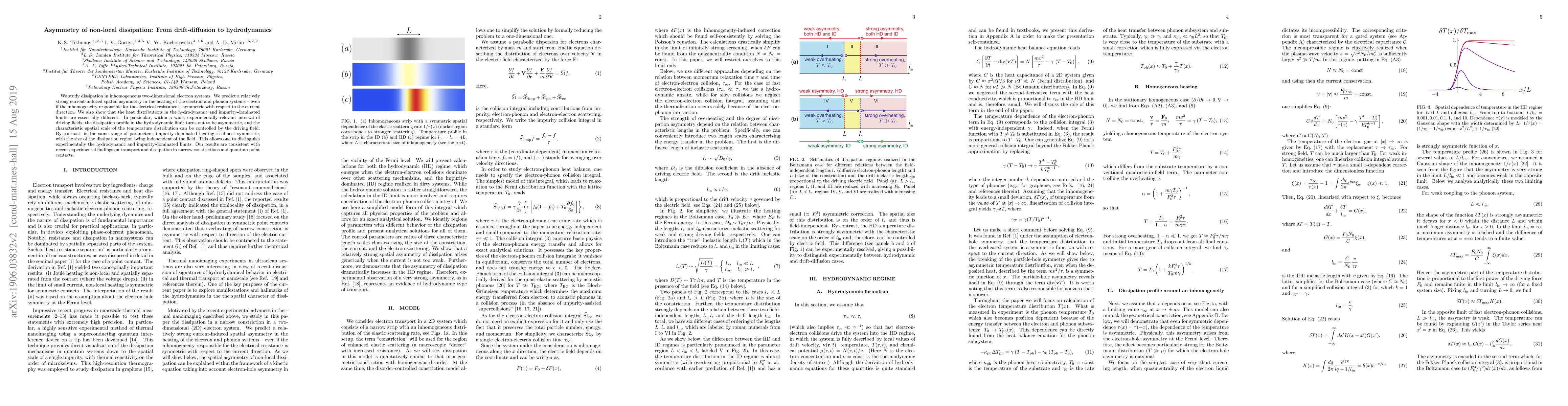 We study dissipation in inhomogeneous two-dimensional electron systems. We predict a relatively strong current-induced spatial asymmetry in the heating of the electron and phonon systems -- even if the inhomogeneity responsible for the electrical resistance is symmetric with respect to the current direction. We also show that the heat distributions in the hydrodynamic and impurity-dominated limits are essentially different. In particular, within a wide, experimentally relevant interval of driving fields, the dissipation profile in the hydrodynamic limit turns out to be asymmetric, and the characteristic spatial scale of the temperature distribution can be controlled by the driving field. By contrast, in the same range of parameters, impurity-dominated heating is almost symmetric, with the size of the dissipation region being independent of the field. This allows one to distinguish experimentally the hydrodynamic and impurity-dominated limits. Our results are consistent with recent experimental findings on transport and dissipation in narrow constrictions and quantum point contacts.