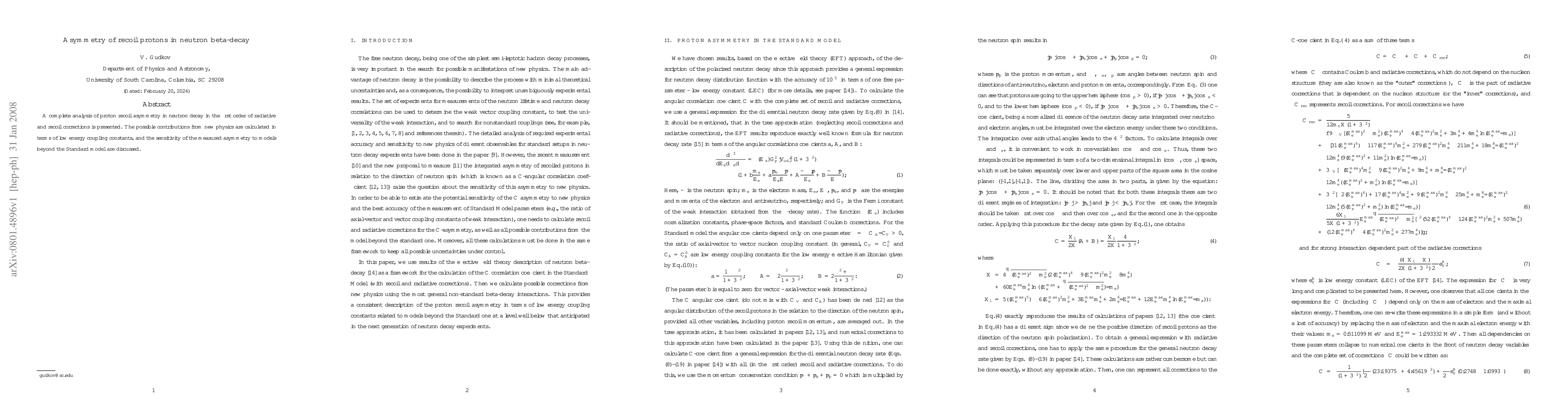 This paper analyzes proton recoil asymmetry in neutron beta-decay, incorporating radiative and recoil corrections, and explores potential contributions from new physics through low energy coupling constants, assessing the sensitivity of the asymmetry to models beyond the Standard Model.