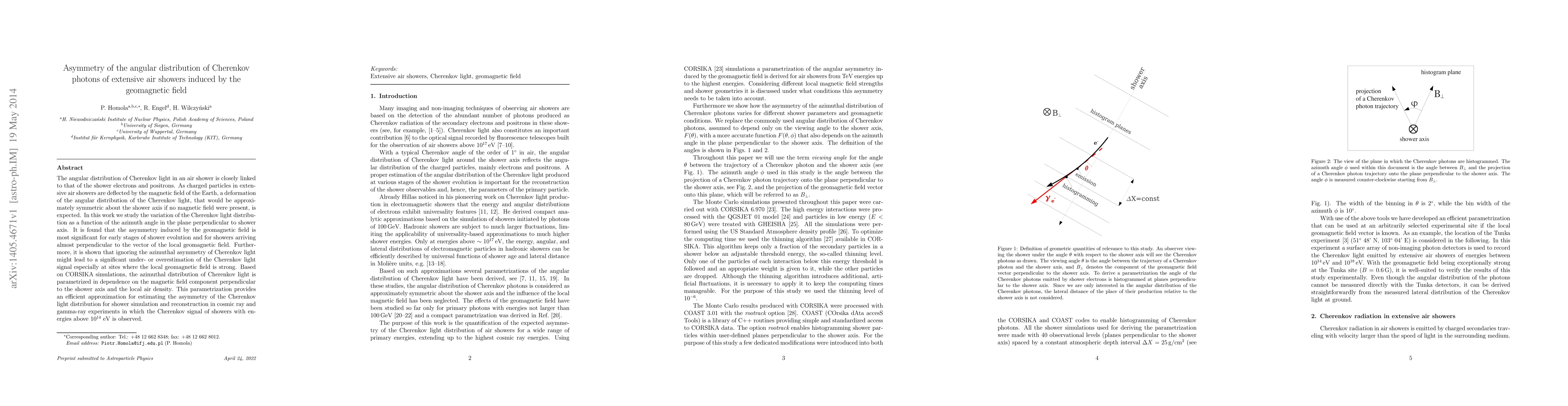 This paper investigates how the geomagnetic field affects the angular distribution of Cherenkov photons in extensive air showers, finding significant asymmetry in the early stages of shower evolution and for near-vertical incidence showers. The study provides a parametrization for the azimuthal distribution of Cherenkov light based on CORSIKA simulations, which is crucial for accurate simulation and reconstruction in high-energy cosmic ray and gamma-ray experiments.