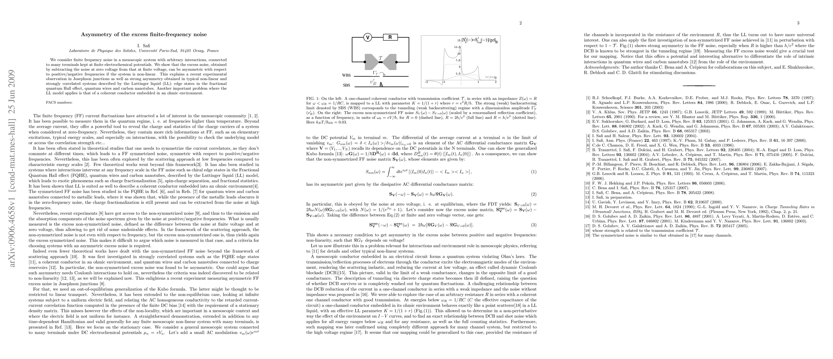 We consider finite frequency noise in a mesoscopic system with arbitrary interactions, connected to many terminals kept at finite electrochemical potentials. We show that the excess noise, obtained by subtracting the noise at zero voltage from that at finite voltage, can be asymmetric with respect to positive/negative frequencies if the system is non-linear. This explains a recent experimental observation in Josephson junctions as well as strong asymmetry obtained in typical non-linear and strongly correlated systems described by the Luttinger liquid (LL): edge states in the fractional quantum Hall effect, quantum wires and carbon nanotubes. Another important problem where the LL model applies is that of a coherent conductor embedded in an ohmic environment.
