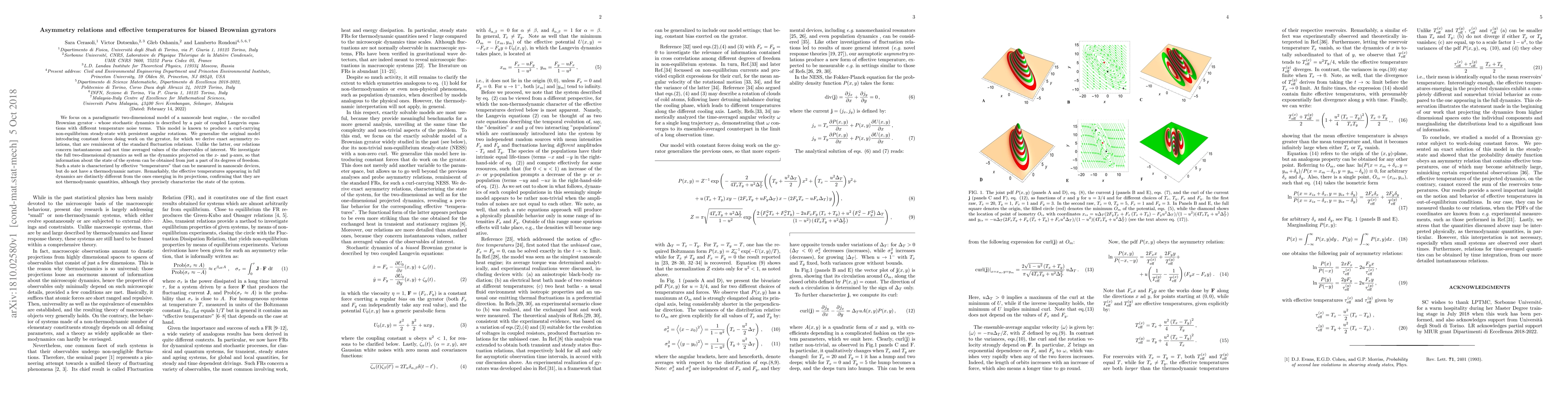 This paper explores a nanoscale Brownian gyrator model, deriving exact asymmetry relations for biased dynamics and investigating effective temperatures in full and projected dynamics, revealing they are non-thermodynamic and distinct.