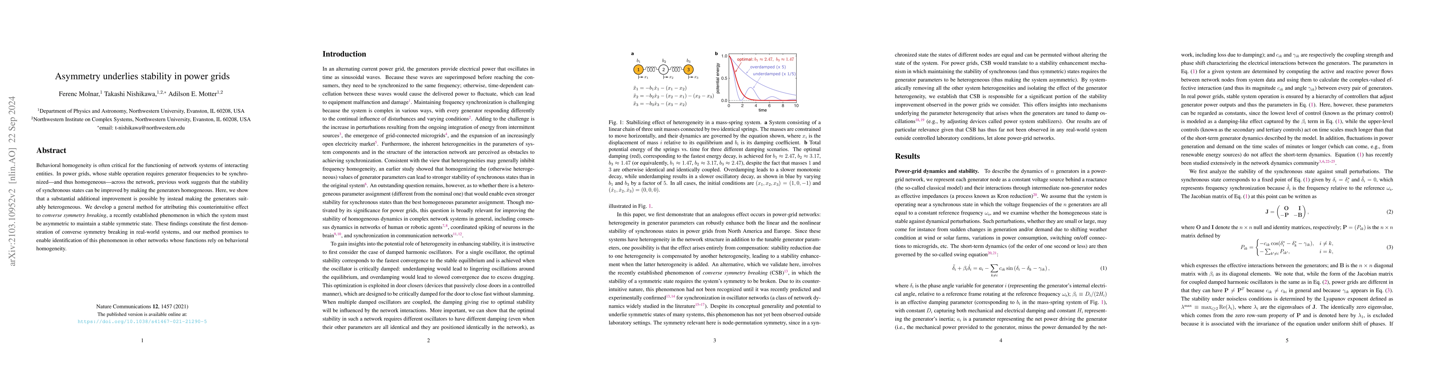 Behavioral homogeneity is often critical for the functioning of network systems of interacting entities. In power grids, whose stable operation requires generator frequencies to be synchronized--and thus homogeneous--across the network, previous work suggests that the stability of synchronous states can be improved by making the generators homogeneous. Here, we show that a substantial additional improvement is possible by instead making the generators suitably heterogeneous. We develop a general method for attributing this counterintuitive effect to converse symmetry breaking, a recently established phenomenon in which the system must be asymmetric to maintain a stable symmetric state. These findings constitute the first demonstration of converse symmetry breaking in real-world systems, and our method promises to enable identification of this phenomenon in other networks whose functions rely on behavioral homogeneity.