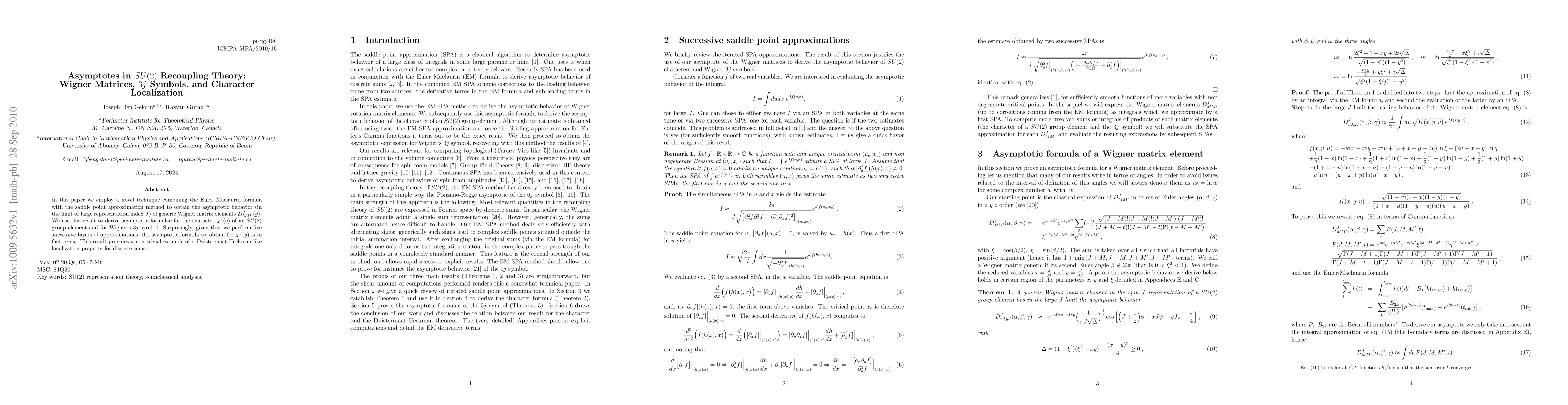 In this paper we employ a novel technique combining the Euler Maclaurin formula with the saddle point approximation method to obtain the asymptotic behavior (in the limit of large representation index $J$) of generic Wigner matrix elements $D^{J}_{MM'}(g)$. We use this result to derive asymptotic formulae for the character $\chi^J(g)$ of an SU(2) group element and for Wigner's $3j$ symbol. Surprisingly, given that we perform five successive layers of approximations, the asymptotic formula we obtain for $\chi^J(g)$ is in fact exact. This result provides a non trivial example of a Duistermaat-Heckman like localization property for discrete sums.