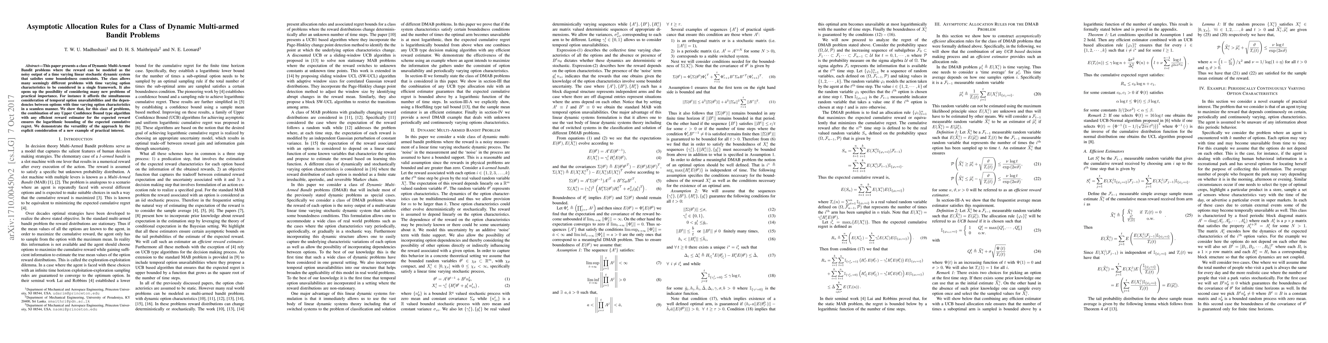 This paper presents a class of Dynamic Multi-Armed Bandit problems where the reward can be modeled as the noisy output of a time varying linear stochastic dynamic system that satisfies some boundedness constraints. The class allows many seemingly different problems with time varying option characteristics to be considered in a single framework. It also opens up the possibility of considering many new problems of practical importance. For instance it affords the simultaneous consideration of temporal option unavailabilities and the depen- dencies between options with time varying option characteristics in a seamless manner. We show that, for this class of problems, the combination of any Upper Confidence Bound type algorithm with any efficient reward estimator for the expected reward ensures the logarithmic bounding of the expected cumulative regret. We demonstrate the versatility of the approach by the explicit consideration of a new example of practical interest.