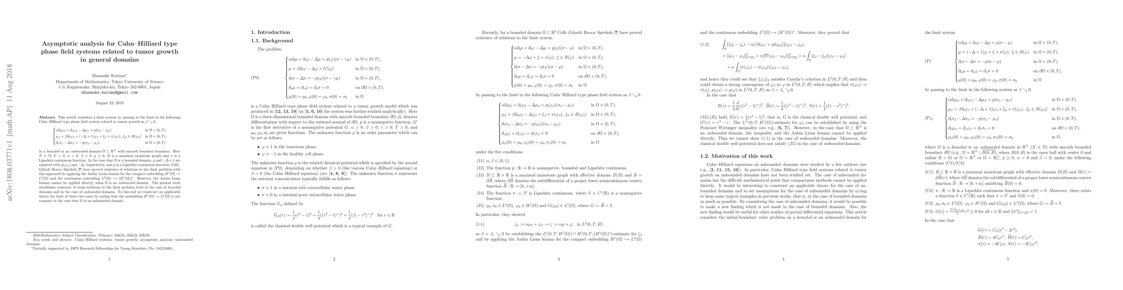 This article considers a limit system by passing to the limit in the following Cahn--Hilliard type phase field system related to tumor growth as $\beta\searrow0$: \begin{equation*} \begin{cases} \alpha\partial_{t} \mu_{\beta} + \partial_{t} \varphi_{\beta}-\Delta\mu_{\beta} = p(\sigma_{\beta} - \mu_{\beta}) & \mbox{in}\ \Omega\times(0, T), \\[1mm] \mu_{\beta} = \beta\partial_{t} \varphi_{\beta} + (-\Delta+1)\varphi_{\beta} + \xi_{\beta} + \pi(\varphi_{\beta}),\ \xi_{\beta} \in B(\varphi_{\beta}) & \mbox{in}\ \Omega\times(0, T), \\[1mm] \partial_{t} \sigma_{\beta} -\Delta\sigma_{\beta} = -p(\sigma_{\beta} - \mu_{\beta}) & \mbox{in}\ \Omega\times(0, T) \end{cases} \end{equation*} in a bounded or an unbounded domain $\Omega \subset \mathbb{R}^{N}$ with smooth bounded boundary. Here $N\in\mathbb{N}$, $T>0$, $\alpha>0$, $\beta>0$, $p\geq0$, $B$ is a maximal monotone graph and $\pi$ is a Lipschitz continuous function. In the case that $\Omega$ is a bounded domain, $p$ and $-\Delta+1$ are replaced with $p(\varphi_{\beta})$ and $-\Delta$, respectively, and $p$ is a Lipschitz continuous function, Colli--Gilardi--Rocca--Sprekels (2017) have proved existence of solutions to the limit problem with this approach by applying the Aubin--Lions lemma for the compact embedding $H^1(\Omega) \hookrightarrow L^2(\Omega)$ and the continuous embedding $L^2(\Omega) \hookrightarrow (H^1(\Omega))^{*}$. However, the Aubin--Lions lemma cannot be applied directly when $\Omega$ is an unbounded domain. The present work establishes existence of weak solutions to the limit problem both in the case of bounded domains and in the case of unbounded domains. To this end we construct an applicable theory for both of these two cases by noting that the embedding $H^1(\Omega) \hookrightarrow L^2(\Omega)$ is not compact in the case that $\Omega$ is an unbounded domain.