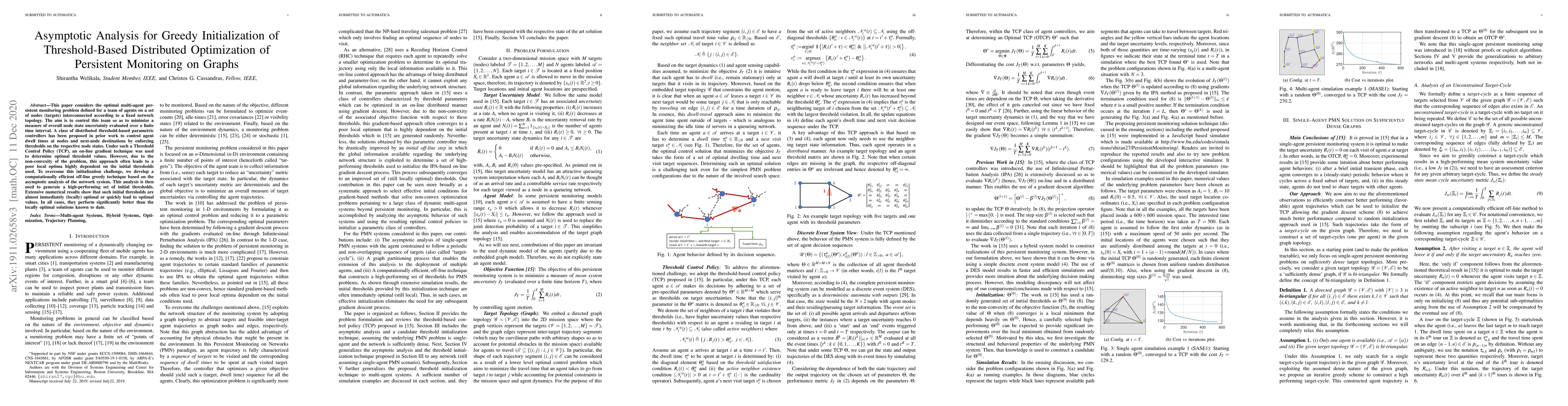 This paper considers the optimal multi-agent persistent monitoring problem defined for a team of agents on a set of nodes (targets) interconnected according to a fixed network topology. The aim is to control this team so as to minimize a measure of overall node state uncertainty evaluated over a finite time interval. A class of distributed threshold-based parametric controllers has been proposed in prior work to control agent dwell times at nodes and next-node destinations by enforcing thresholds on the respective node states. Under such a Threshold Control Policy (TCP), an on-line gradient technique was used to determine optimal threshold values. However, due to the non-convexity of the problem, this approach often leads to a poor local optima highly dependent on the initial thresholds used. To overcome this initialization challenge, we develop a computationally efficient off-line greedy technique based on the asymptotic analysis of the network system. This analysis is then used to generate a high-performing set of initial thresholds. Extensive numerical results show that such initial thresholds are almost immediately (locally) optimal or quickly lead to optimal values. In all cases, they perform significantly better than the locally optimal solutions known to date.