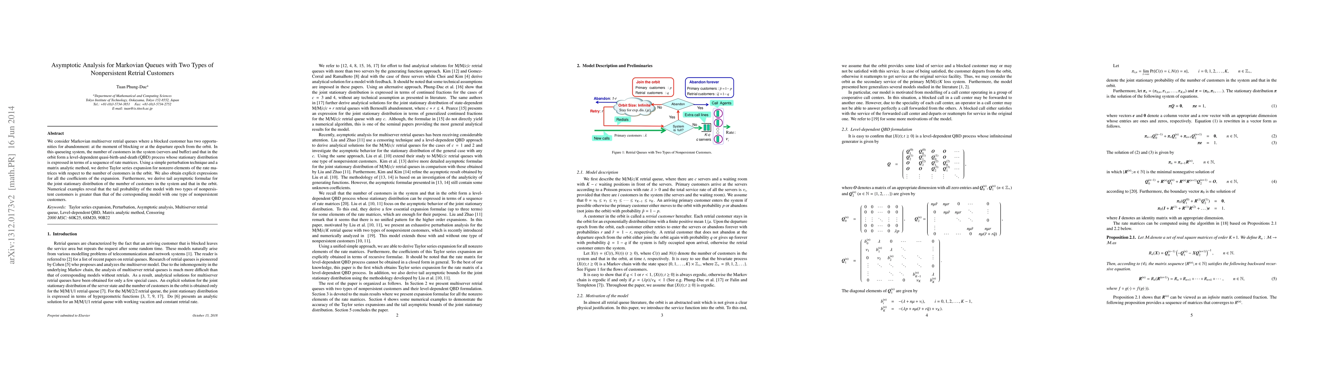 We consider Markovian multiserver retrial queues where a blocked customer has two opportunities for abandonment: at the moment of blocking or at the departure epoch from the orbit. In this queueing system, the number of customers in the system (servers and buffer) and that in the orbit form a level-dependent quasi-birth-and-death (QBD) process whose stationary distribution is expressed in terms of a sequence of rate matrices. Using a simple perturbation technique and a matrix analytic method, we derive Taylor series expansion for nonzero elements of the rate matrices with respect to the number of customers in the orbit. We also obtain explicit expressions for all the coefficients of the expansion. Furthermore, we derive tail asymptotic formulae for the joint stationary distribution of the number of customers in the system and that in the orbit. Numerical examples reveal that the tail probability of the model with two types of nonpersistent customers is greater than that of the corresponding model with one type of nonpersistent customers.
