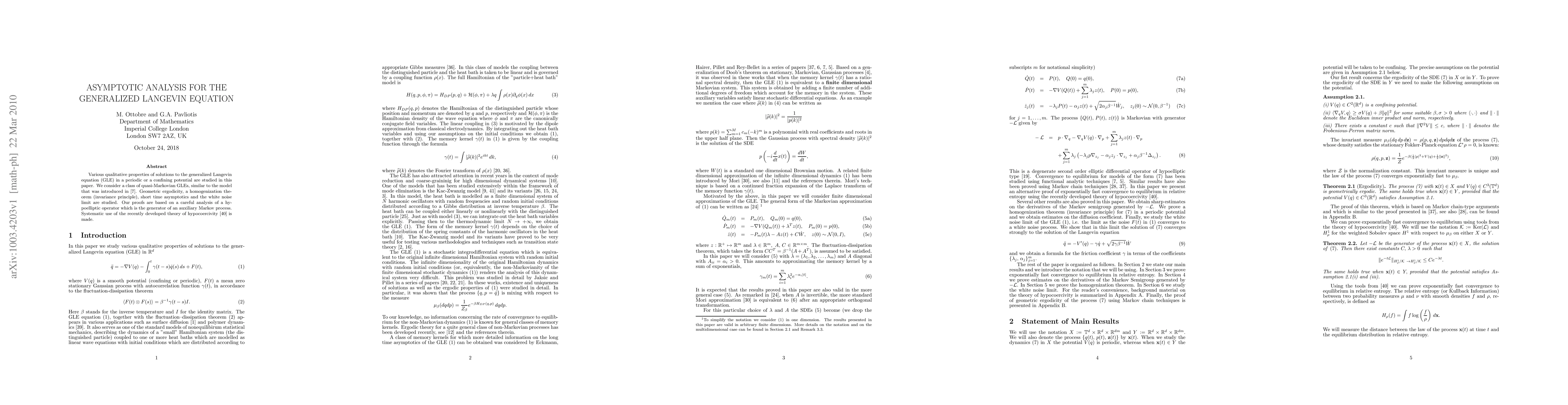 Various qualitative properties of solutions to the generalized Langevin equation (GLE) in a periodic or a confining potential are studied in this paper. We consider a class of quasi-Markovian GLEs, similar to the model that was introduced in \cite{EPR99}. Geometric ergodicity, a homogenization theorem (invariance principle), short time asymptotics and the white noise limit are studied. Our proofs are based on a careful analysis of a hypoelliptic operator which is the generator of an auxiliary Markov process. Systematic use of the recently developed theory of hypocoercivity \cite{Vil04HPI} is made.