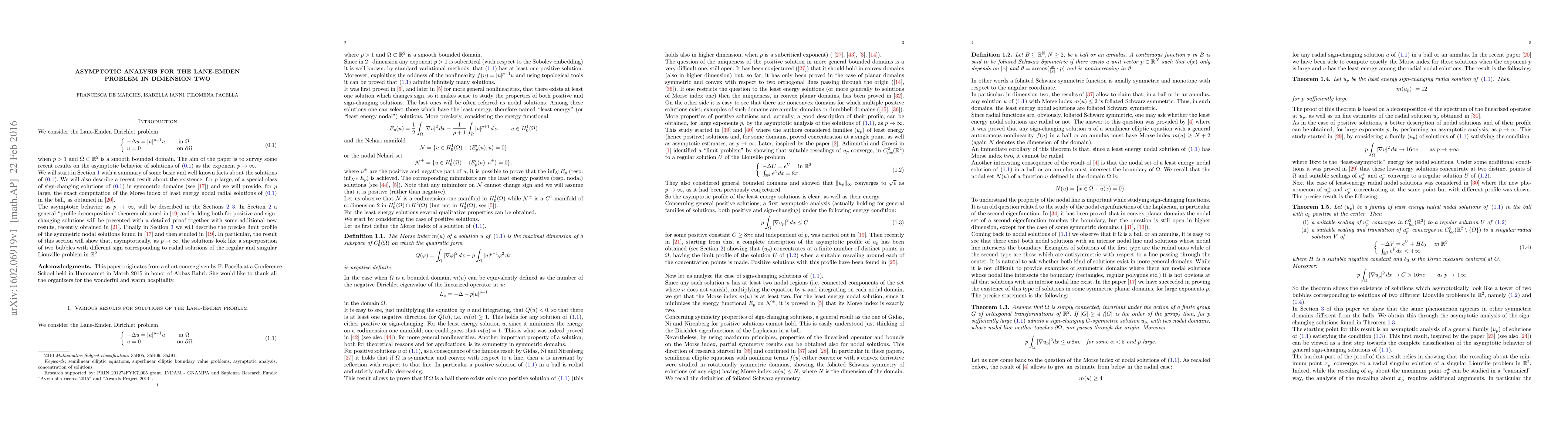This paper surveys recent findings on the asymptotic behavior of solutions to the Lane-Emden Dirichlet problem in two dimensions as the exponent approaches infinity, focusing on the equation \(-\Delta u = |u|^{p-1}u\) with boundary conditions \(u=0\) on \(\partial \Omega\).