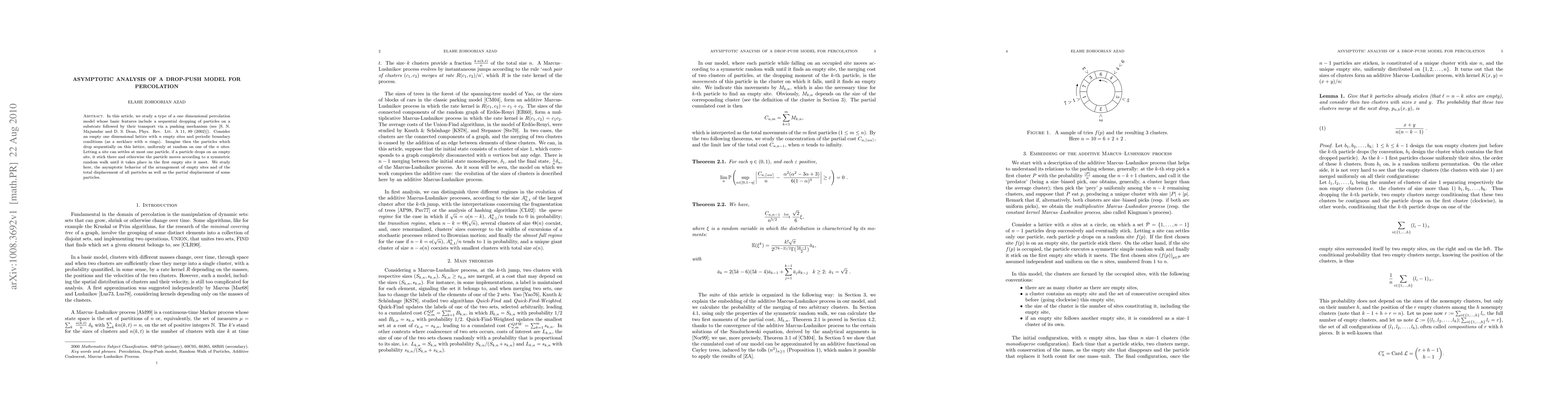 In this article, we study a type of a one dimensional percolation model whose basic features include a sequential dropping of particles on a substrate followed by their transport via a pushing mechanism (see [S. N. Majumdar and D. S. Dean, Phys. Rev. Ltt. A 11, 89 (2002)]). Consider an empty one dimensional lattice with n empty sites and periodic boundary conditions (as a necklace with n rings). Imagine then the particles which drop sequentially on this lattice, uniformly at random on one of the n sites. Letting a site can settles at most one particle, if a particle drops on an empty site, it stick there and otherwise the particle moves according to a symmetric random walk until it takes place in the first empty site it meet. We study here, the asymptotic behavior of the arrangement of empty sites and of the total displacement of all particles as well as the partial displacement of some particles.