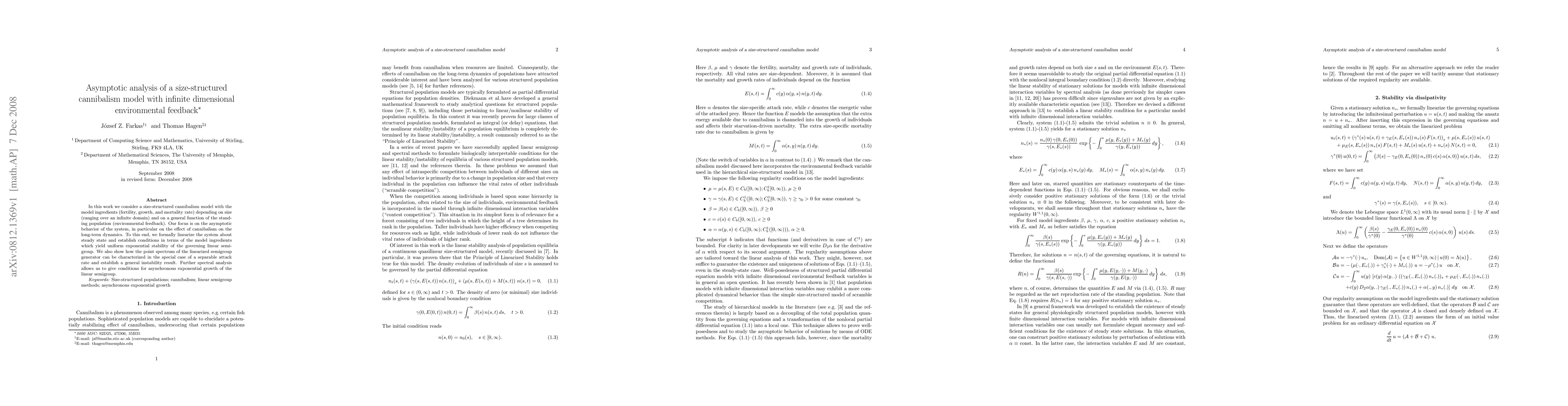 This paper analyzes the asymptotic behavior of a size-structured cannibalism model with environmental feedback, focusing on the long-term dynamics influenced by cannibalism. It establishes conditions for uniform exponential stability and characterizes the point spectrum of the linearized system, revealing conditions for asynchronous exponential growth.
