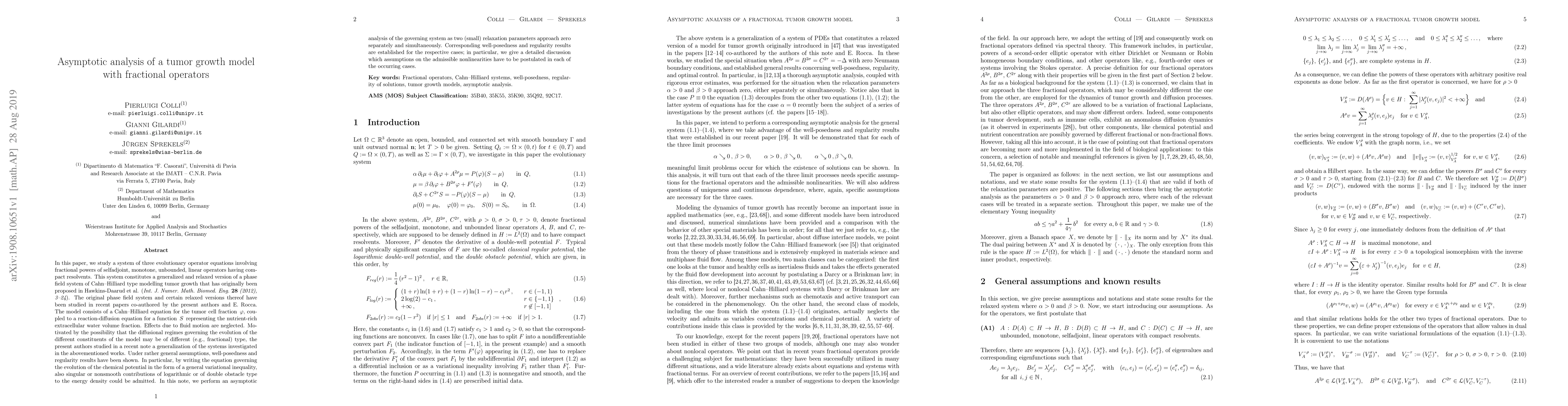 This paper investigates a generalized tumor growth model using fractional operators, focusing on a system of evolutionary operator equations. It performs an asymptotic analysis as relaxation parameters approach zero, establishing well-posedness and regularity results under specific assumptions on the nonlinearities.