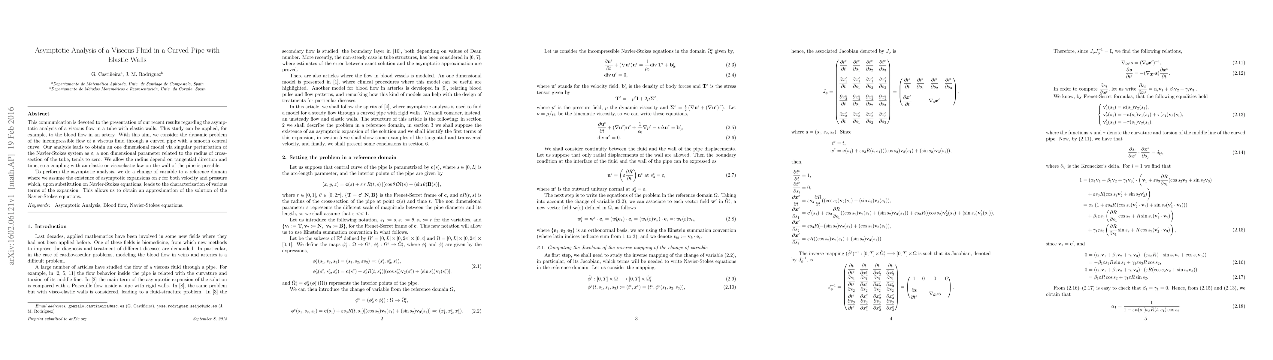 This paper presents an asymptotic analysis of viscous fluid flow in a curved pipe with elastic walls, deriving a one-dimensional model via singular perturbation of the Navier-Stokes equations. The study applies to scenarios like blood flow in arteries, considering the dynamic interaction between fluid flow and elastic wall deformation.