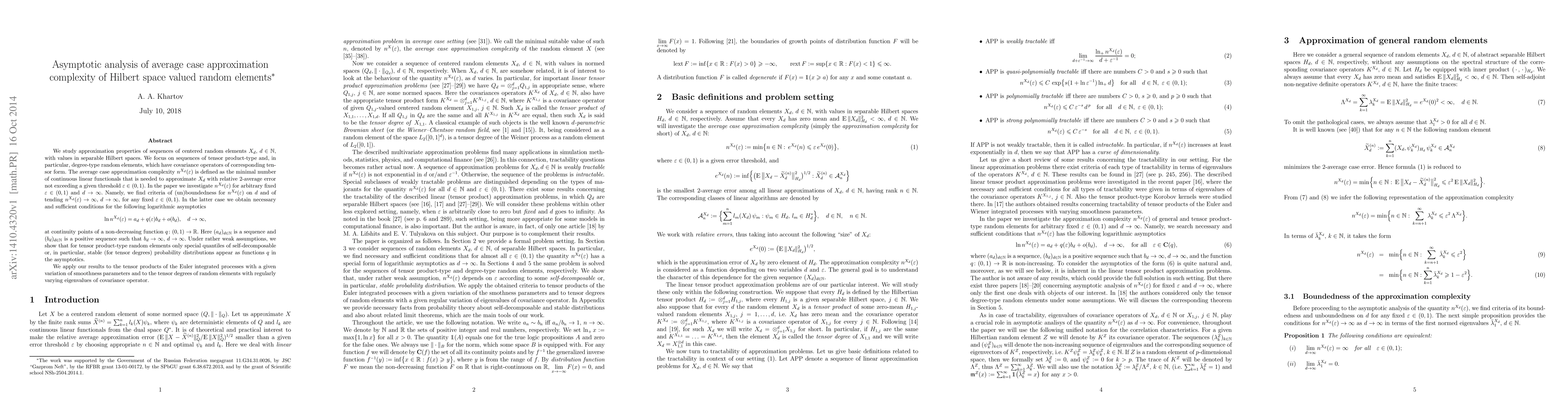 We study approximation properties of sequences of centered random elements $X_d$, $d\in\mathbb N$, with values in separable Hilbert spaces. We focus on sequences of tensor product-type and, in particular, degree-type random elements, which have covariance operators of corresponding tensor form. The average case approximation complexity $n^{X_d}(\varepsilon)$ is defined as the minimal number of continuous linear functionals that is needed to approximate $X_d$ with relative $2$-average error not exceeding a given threshold $\varepsilon\in(0,1)$. In the paper we investigate $n^{X_d}(\varepsilon)$ for arbitrary fixed $\varepsilon\in(0,1)$ and $d\to\infty$. Namely, we find criteria of (un)boundedness for $n^{X_d}(\varepsilon)$ on $d$ and of tending $n^{X_d}(\varepsilon)\to\infty$, $d\to\infty$, for any fixed $\varepsilon\in(0,1)$. In the latter case we obtain necessary and sufficient conditions for the following logarithmic asymptotics \begin{eqnarray*} \ln n^{X_d}(\varepsilon)= a_d+q(\varepsilon)b_d+o(b_d),\quad d\to\infty, \end{eqnarray*} at continuity points of a non-decreasing function $q\colon (0,1)\to\mathbb R$. Here $(a_d)_{d\in\mathbb N}$ is a sequence and $(b_d)_{d\in\mathbb N}$ is a positive sequence such that $b_d\to\infty$, $d\to\infty$. Under rather weak assumptions, we show that for tensor product-type random elements only special quantiles of self-decomposable or, in particular, stable (for tensor degrees) probability distributions appear as functions $q$ in the asymptotics. We apply our results to the tensor products of the Euler integrated processes with a given variation of smoothness parameters and to the tensor degrees of random elements with regularly varying eigenvalues of covariance operator.