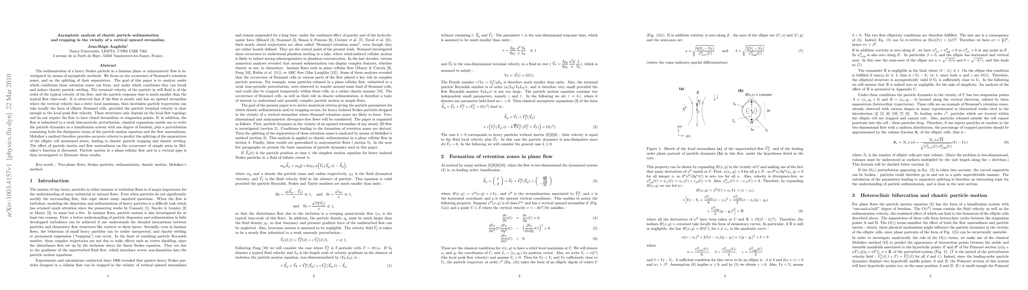 The sedimentation of a heavy Stokes particle in a laminar plane or axisymmetric flow is investigated by means of asymptotic methods. We focus on the occurrence of Stommel's retention zones, and on the splitting of their separatrices. The goal of this paper is to analyze under which conditions these retention zones can form, and under which conditions they can break and induce chaotic particle settling. The terminal velocity of the particle in still fluid is of the order of the typical velocity of the flow, and the particle response time is much smaller than the typical flow time-scale. It is observed that if the flow is steady and has an upward streamline where the vertical velocity has a strict local maximum, then inertialess particle trajectories can take locally the form of elliptic Stommel cells, provided the particle terminal velocity is close enough to the local peak flow velocity. These structures only depend on the local flow topology and do not require the flow to have closed streamlines or stagnation points. If, in addition, the flow is submitted to a weak time-periodic perturbation, classical expansions enable one to write the particle dynamics as a hamiltonian system with one degree of freedom, plus a perturbation containing both the dissipative terms of the particle motion equation and the flow unsteadiness. Melnikov's method therefore provides accurate criteria to predict the splitting of the separatrices of the elliptic cell mentioned above, leading to chaotic particle trapping and chaotic settling. The effect of particle inertia and flow unsteadiness on the occurrence of simple zeros in Melnikov's function is discussed. Particle motion in a plane cellular flow and in a vertical pipe is then investigated to illustrate these results.