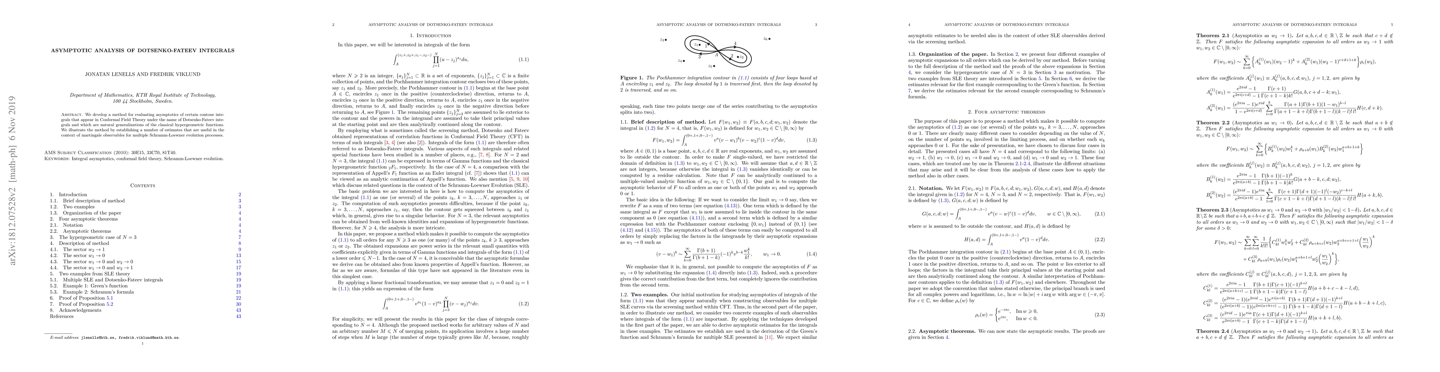 We develop a method for evaluating asymptotics of certain contour integrals that appear in Conformal Field Theory under the name of Dotsenko-Fateev integrals and which are natural generalizations of the classical hypergeometric functions. We illustrate the method by establishing a number of estimates that are useful in the context of martingale observables for multiple Schramm-Loewner evolution processes.