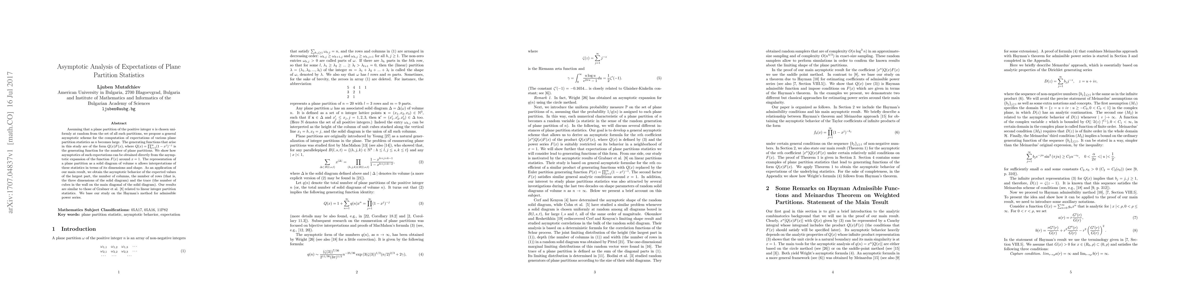 Assuming that a plane partition of the positive integer $n$ is chosen uniformly at random from the set of all such partitions, we propose a general asymptotic scheme for the computation of expectations of various plane partition statistics as $n$ becomes large. The generating functions that arise in this study are of the form $Q(x)F(x)$, where $Q(x)=\prod_{j=1}^\infty (1-x^j)^{-j}$ is the generating function for the number of plane partitions. We show how asymptotics of such expectations can be obtained directly from the asymptotic expansion of the function $F(x)$ around $x=1$. The representation of a plane partition as a solid diagram of volume $n$ allows interpretations of these statistics in terms of its dimensions and shape. As an application of our main result, we obtain the asymptotic behavior of the expected values of the largest part (the height of the solid diagram) and the trace (the number of cubes in the wall on the main diagonal of the solid diagram). Our results are similar to those of Grabner et al. (2014) related to linear integer partition statistics. We base our study on Hayman's method for admissible power series.