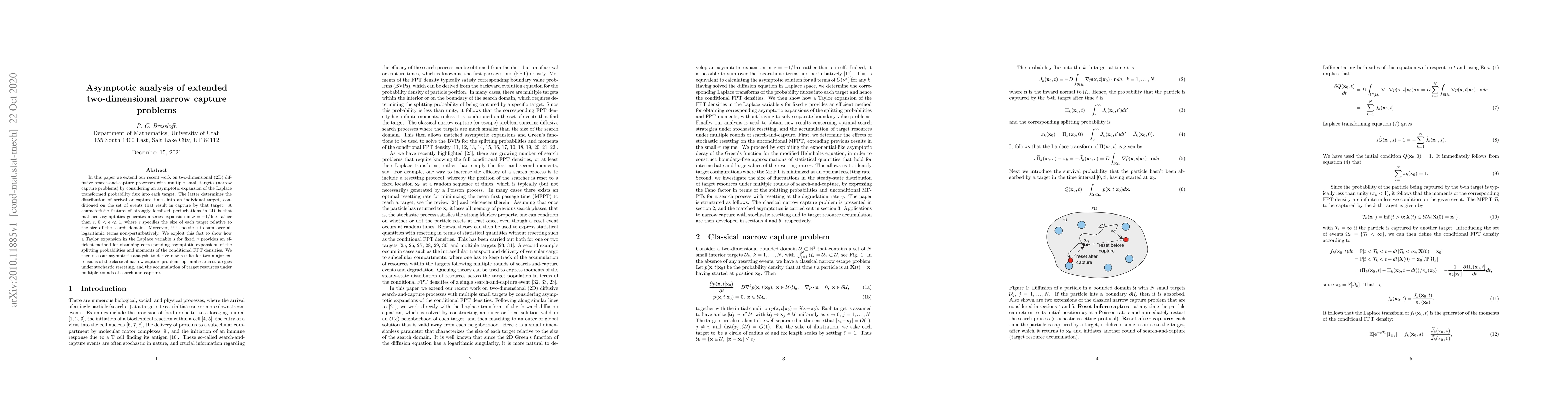 In this paper we extend our recent work on two-dimensional (2D) diffusive search-and-capture processes with multiple small targets (narrow capture problems) by considering an asymptotic expansion of the Laplace transformed probability flux into each target. The latter determines the distribution of arrival or capture times into an individual target, conditioned on the set of events that result in capture by that target. A characteristic feature of strongly localized perturbations in 2D is that matched asymptotics generates a series expansion in $\nu=-1/\ln \epsilon$ rather than $\epsilon$, $0<\epsilon\ll 1$, where $\epsilon$ specifies the size of each target relative to the size of the search domain. Moreover, it is possible to sum over all logarithmic terms non-perturbatively. We exploit this fact to show how a Taylor expansion in the Laplace variable $s$ for fixed $\nu$ provides an efficient method for obtaining corresponding asymptotic expansions of the splitting probabilities and moments of the conditional FPT densities. We then use our asymptotic analysis to derive new results for two major extensions of the classical narrow capture problem: optimal search strategies under stochastic resetting, and the accumulation of target resources under multiple rounds of search-and-capture.