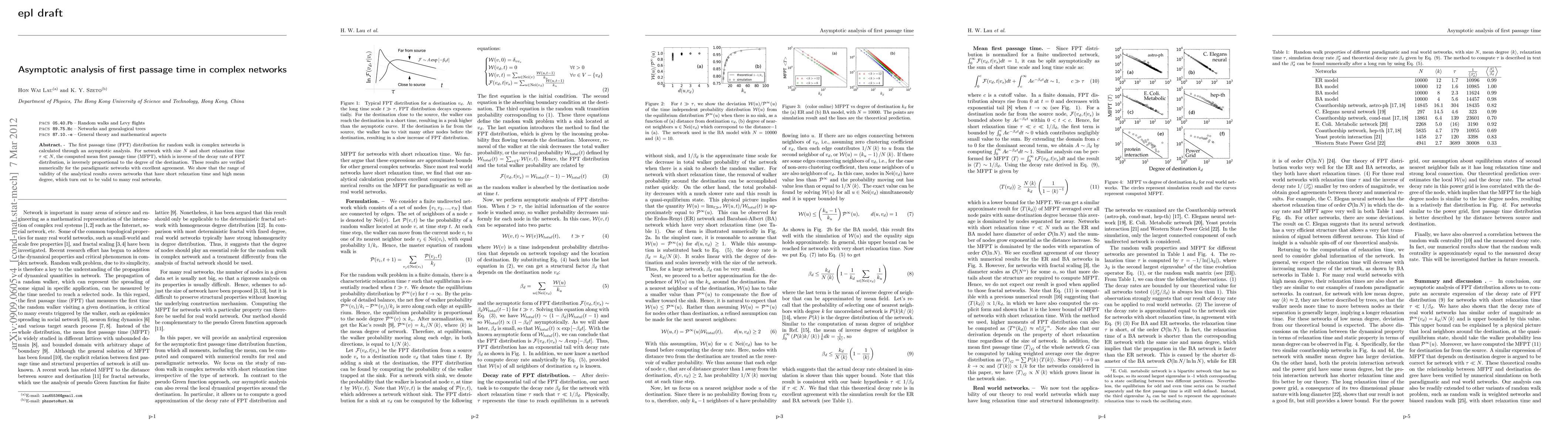 Researchers analyzed the first passage time in complex networks through asymptotic analysis, finding that mean first passage time is inversely proportional to a network's destination degree, with valid results covering short relaxation times and high mean degrees.
