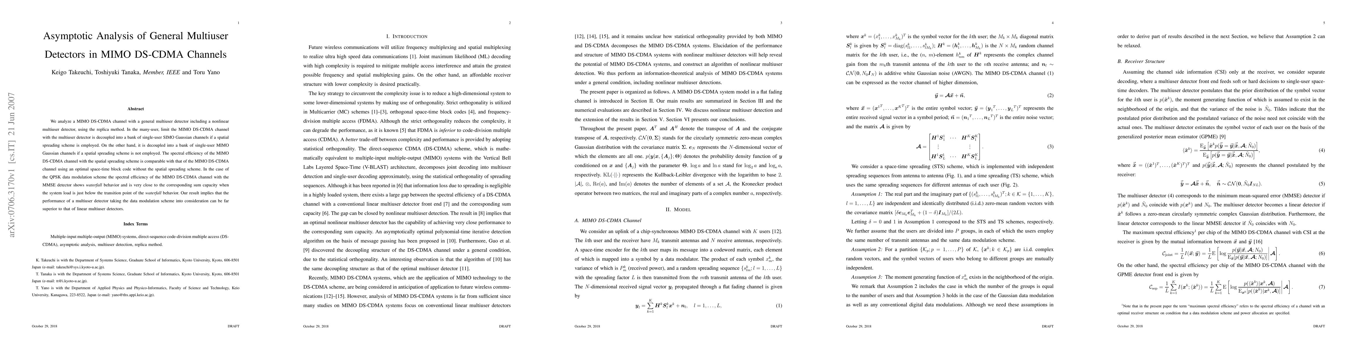This paper analyzes the performance of general multiuser detectors in MIMO DS-CDMA channels using the replica method, showing that spectral efficiency is comparable to optimal space-time block codes. The study reveals that nonlinear detectors can outperform linear ones, especially near the transition point of "waterfall" behavior in QPSK modulation.