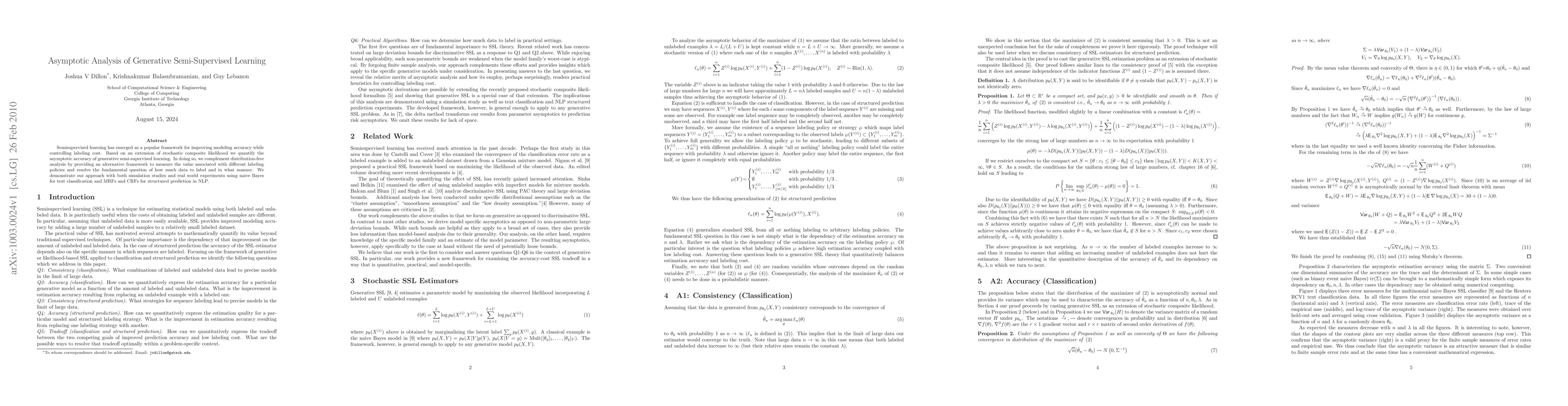 This paper extends stochastic composite likelihood to analyze the asymptotic accuracy of generative semi-supervised learning, offering a new framework to evaluate labeling policies and determine optimal labeling strategies. The approach is validated through simulations and real-world experiments using naive Bayes, MRFs, and CRFs for text classification and structured prediction in NLP.