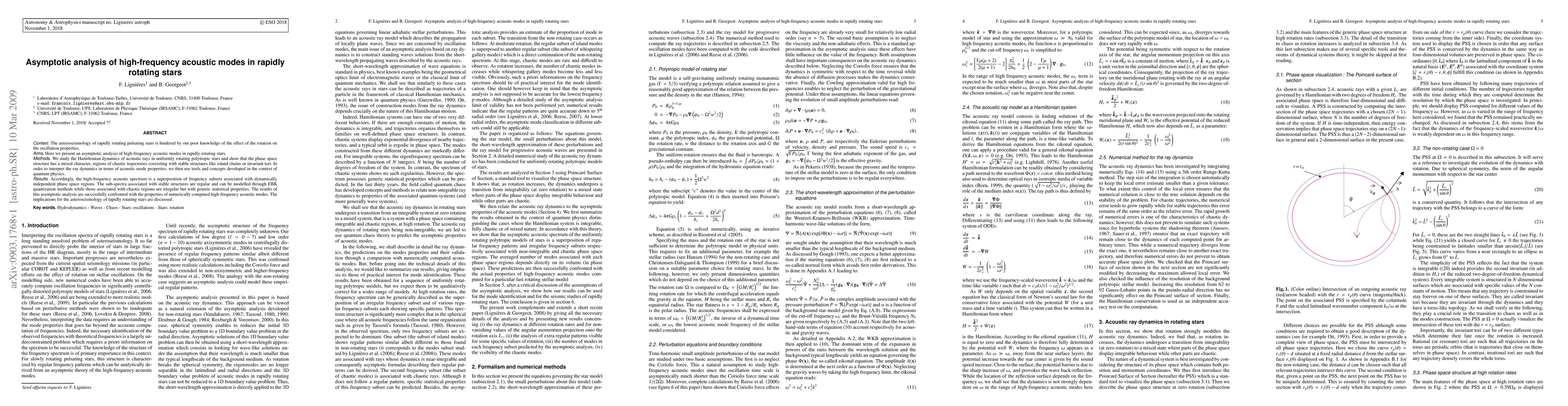 This paper conducts an asymptotic analysis of high-frequency acoustic modes in rapidly rotating stars, revealing a mixed phase space structure with chaotic and stable regions. The study uses Hamiltonian dynamics and quantum physics concepts to interpret the dynamics, leading to a regular sub-spectrum for stable regions and an irregular but statistically predictable sub-spectrum for chaotic regions, validated against numerical computations.