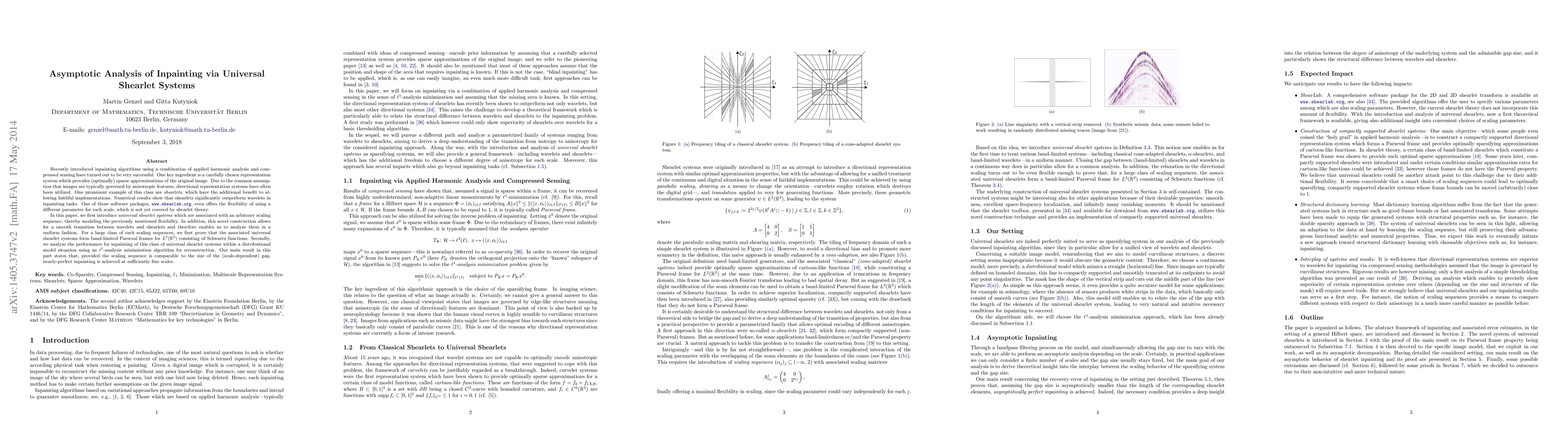 Recently introduced inpainting algorithms using a combination of applied harmonic analysis and compressed sensing have turned out to be very successful. One key ingredient is a carefully chosen representation system which provides (optimally) sparse approximations of the original image. Due to the common assumption that images are typically governed by anisotropic features, directional representation systems have often been utilized. One prominent example of this class are shearlets, which have the additional benefitallowing faithful implementations. Numerical results show that shearlets significantly outperform wavelets in inpainting tasks. One of those software packages, www.shearlab.org, even offers the flexibility of usingdifferent parameter for each scale, which is not yet covered by shearlet theory. In this paper, we first introduce universal shearlet systems which are associated with an arbitrary scaling sequence, thereby modeling the previously mentioned flexibility. In addition, this novel construction allows for a smooth transition between wavelets and shearlets and therefore enables us to analyze them in a uniform fashion. For a large class of such scaling sequences, we first prove that the associated universal shearlet systems form band-limited Parseval frames for $L^2(\mathbb{R}^2)$ consisting of Schwartz functions. Secondly, we analyze the performance for inpainting of this class of universal shearlet systems within a distributional model situation using an $\ell^1$-analysis minimization algorithm for reconstruction. Our main result in this part states that, provided the scaling sequence is comparable to the size of the (scale-dependent) gap, nearly-perfect inpainting is achieved at sufficiently fine scales.