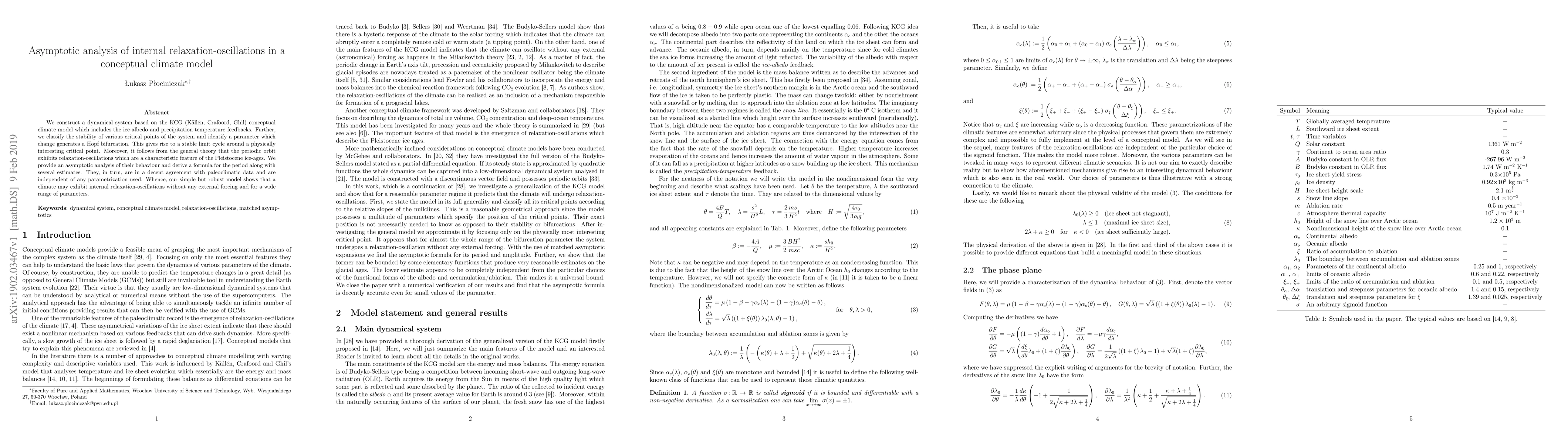 This paper constructs a dynamical system from the KCG conceptual climate model, identifying internal relaxation-oscillations and a Hopf bifurcation leading to a stable limit cycle. The asymptotic analysis provides a formula for the period, which aligns well with paleoclimatic data, demonstrating the model's robustness in predicting Pleistocene ice-age dynamics without external forcing.