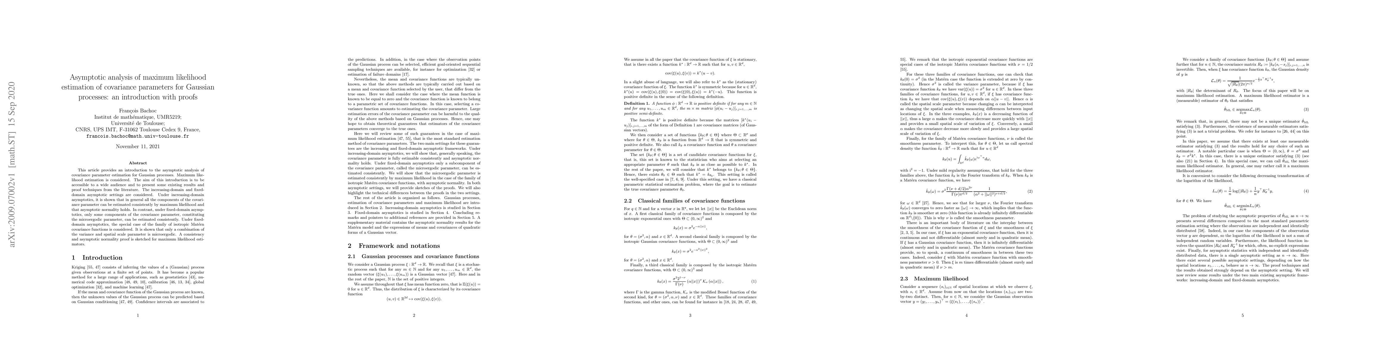 This article provides an introduction to the asymptotic analysis of covariance parameter estimation for Gaussian processes. Maximum likelihood estimation is considered. The aim of this introduction is to be accessible to a wide audience and to present some existing results and proof techniques from the literature. The increasing-domain and fixed-domain asymptotic settings are considered. Under increasing-domain asymptotics, it is shown that in general all the components of the covariance parameter can be estimated consistently by maximum likelihood and that asymptotic normality holds. In contrast, under fixed-domain asymptotics, only some components of the covariance parameter, constituting the microergodic parameter, can be estimated consistently. Under fixed-domain asymptotics, the special case of the family of isotropic Mat\'ern covariance functions is considered. It is shown that only a combination of the variance and spatial scale parameter is microergodic. A consistency and asymptotic normality proof is sketched for maximum likelihood estimators.