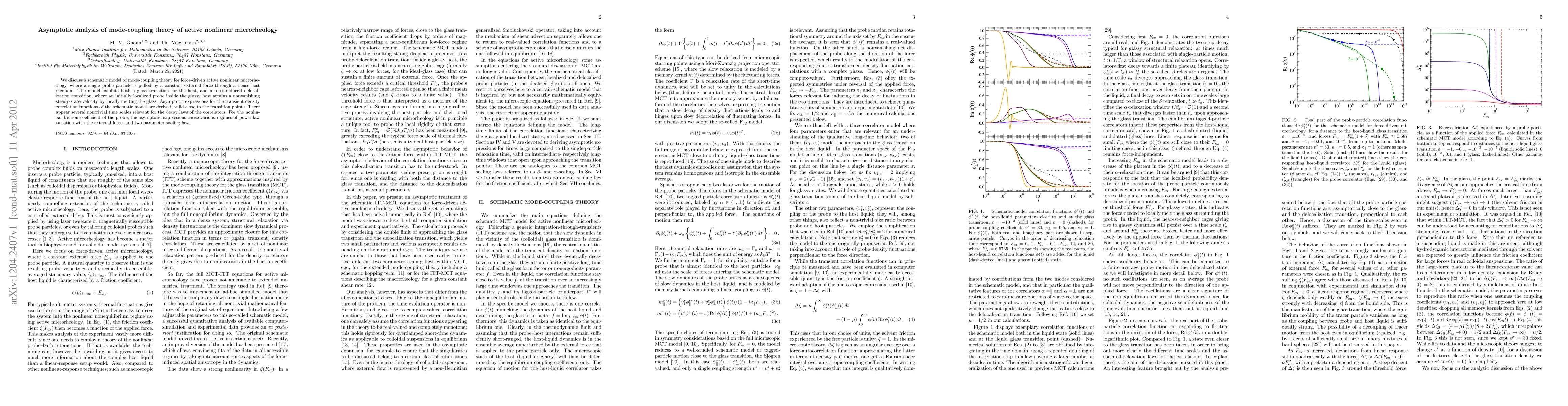 This paper presents an asymptotic analysis of a mode-coupling theory model for active nonlinear microrheology, focusing on a probe particle moving through a dense medium. The study reveals transitions including a glass transition and a force-induced delocalization, with derived expressions for transient density correlation functions and nonlinear friction coefficients, showing power-law regimes and scaling laws.