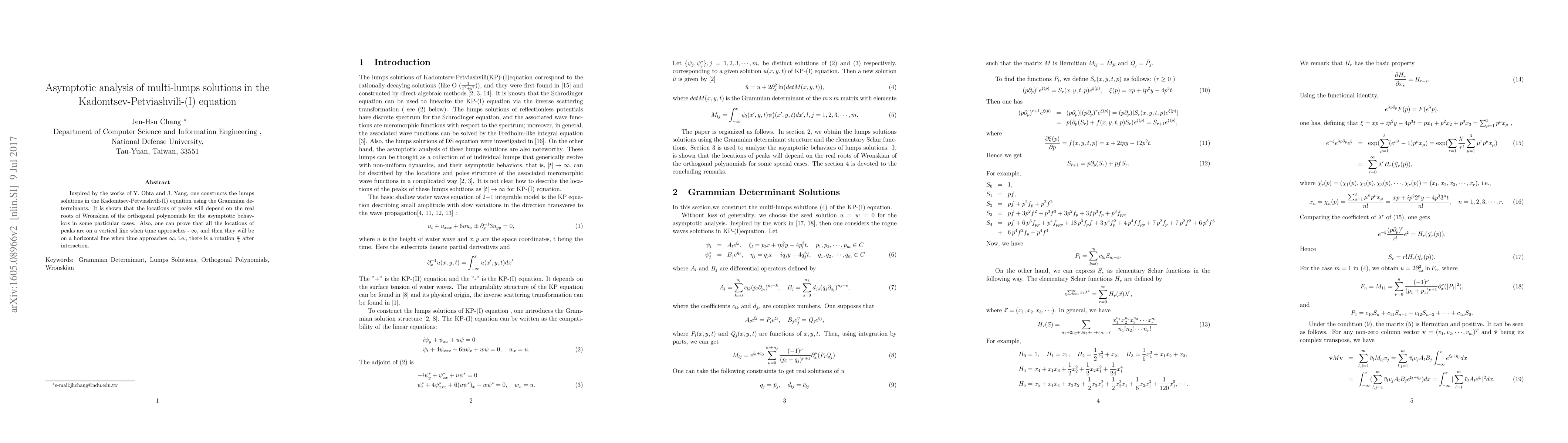 Inspired by the works of Y. Ohta and J. Yang, one constructs the lumps solutions in the Kadomtsev-Petviashvili-(I) equation using the Grammian determinants. It is shown that the locations of peaks will depend on the real roots of Wronskian of the orthogonal polynomials for the asymptotic behaviors in some particular cases. Also, one can prove that all the locations of peaks are on a vertical line when time approaches - $\infty$, and then they will be on a horizontal line when time approaches $\infty$, i.e., there is a rotation $\frac{\pi}{2}$ after interaction.