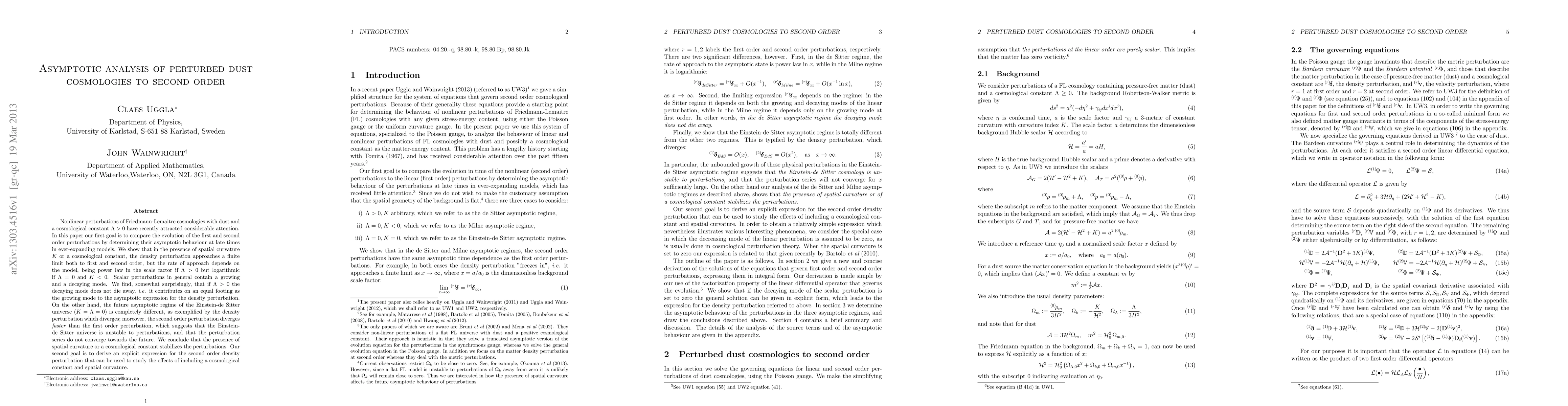 Nonlinear perturbations of Friedmann-Lemaitre cosmologies with dust and a positive cosmological constant have recently attracted considerable attention. In this paper our first goal is to compare the evolution of the first and second order perturbations by determining their asymptotic behaviour at late times in ever-expanding models. We show that in the presence of spatial curvature K or a positive cosmological constant, the density perturbation approaches a finite limit both to first and second order, but the rate of approach depends on the model, being power law in the scale factor if the cosmological constant is positive but logarithmic if it is zero and and K<0. Scalar perturbations in general contain a growing and a decaying mode. We find, somewhat surprisingly, that if the cosmological constant is positive the decaying mode does not die away, i.e. it contributes on an equal footing as the growing mode to the asymptotic expression for the density perturbation. On the other hand, the future asymptotic regime of the Einstein-de Sitter universe (for which the cosmological constant and the spatial curvature are both zero) is completely different, as exemplified by the density perturbation which diverges; moreover, the second order perturbation diverges faster than the first order perturbation, which suggests that the Einstein-de Sitter universe is unstable to perturbations, and that the perturbation series do not converge towards the future. We conclude that the presence of spatial curvature or a cosmological constant stabilizes the perturbations. Our second goal is to derive an explicit expression for the second order density perturbation that can be used to study the effects of including a cosmological constant and spatial curvature.