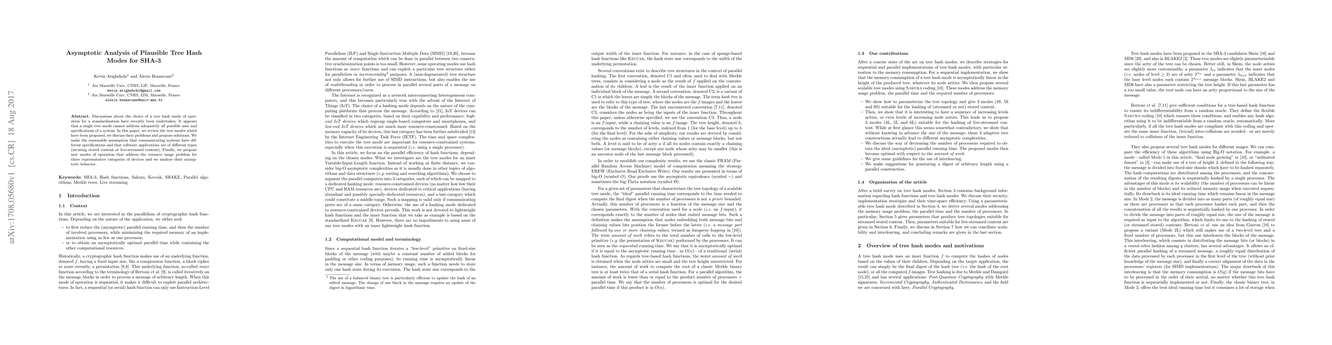 Researchers analyzed tree hash modes for SHA-3, proposing new modes that address resource usage for different types of devices, and analyzed their asymptotic behavior.