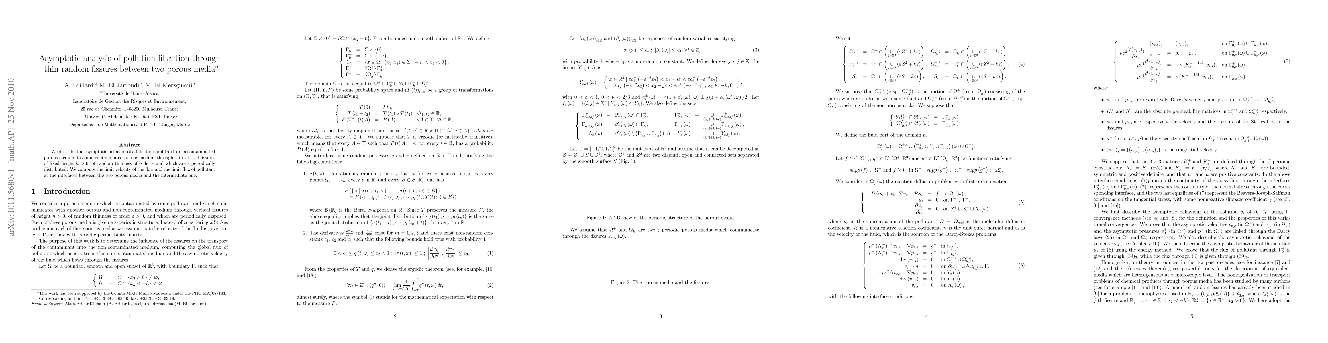 This paper explores the asymptotic behavior of pollutant filtration through thin, randomly distributed fissures between two porous media, determining the limit velocity and flux of the pollutant at the interfaces. The study focuses on the effect of fissures' random thinness and periodic distribution on the filtration process.
