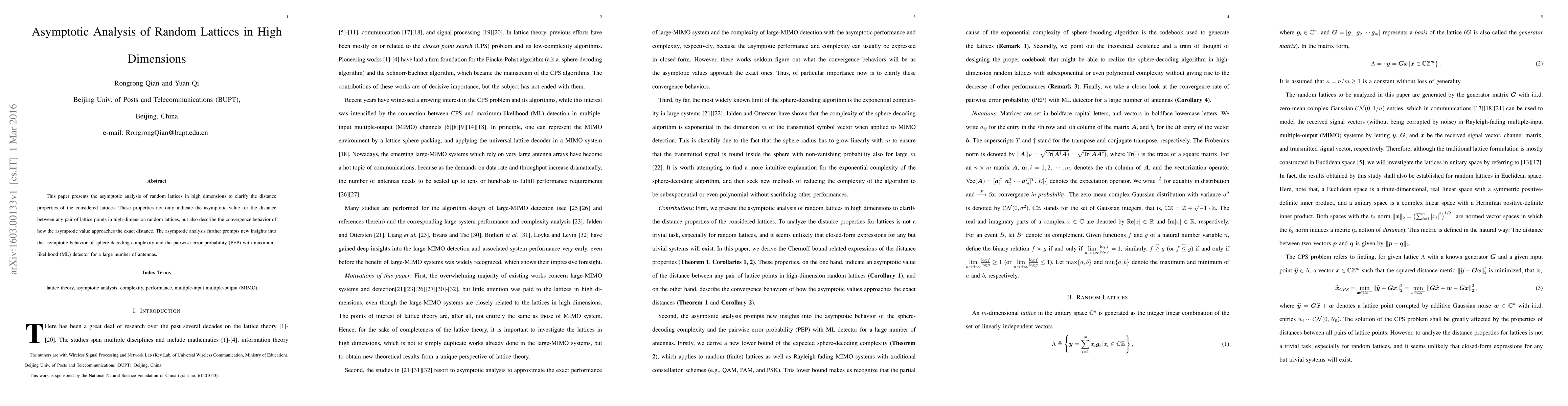 This paper analyzes the asymptotic distance properties of high-dimensional random lattices, revealing the convergence behavior of distances between lattice points and providing insights into sphere-decoding complexity and pairwise error probability for large antenna systems.