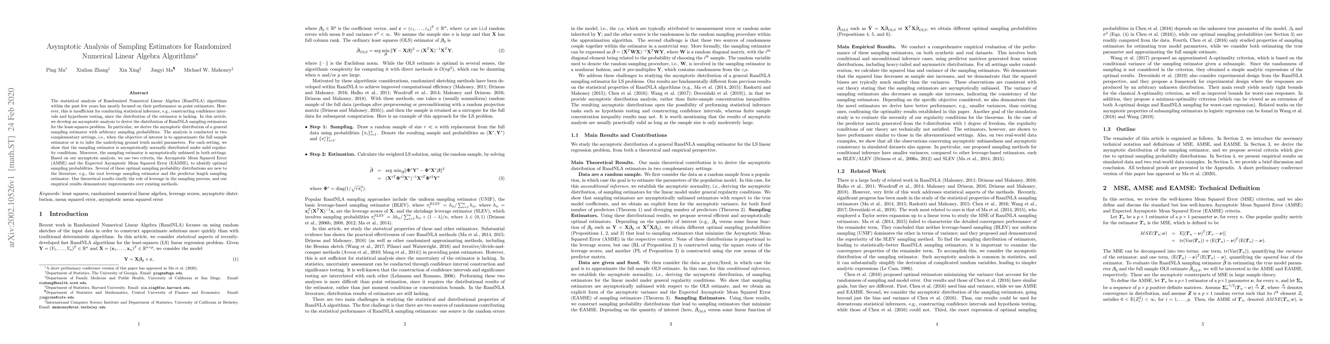 Researchers develop an asymptotic analysis to derive the distribution of sampling estimators for Randomized Numerical Linear Algebra algorithms, finding that these estimators are asymptotically normally distributed under mild conditions and often unbiased.