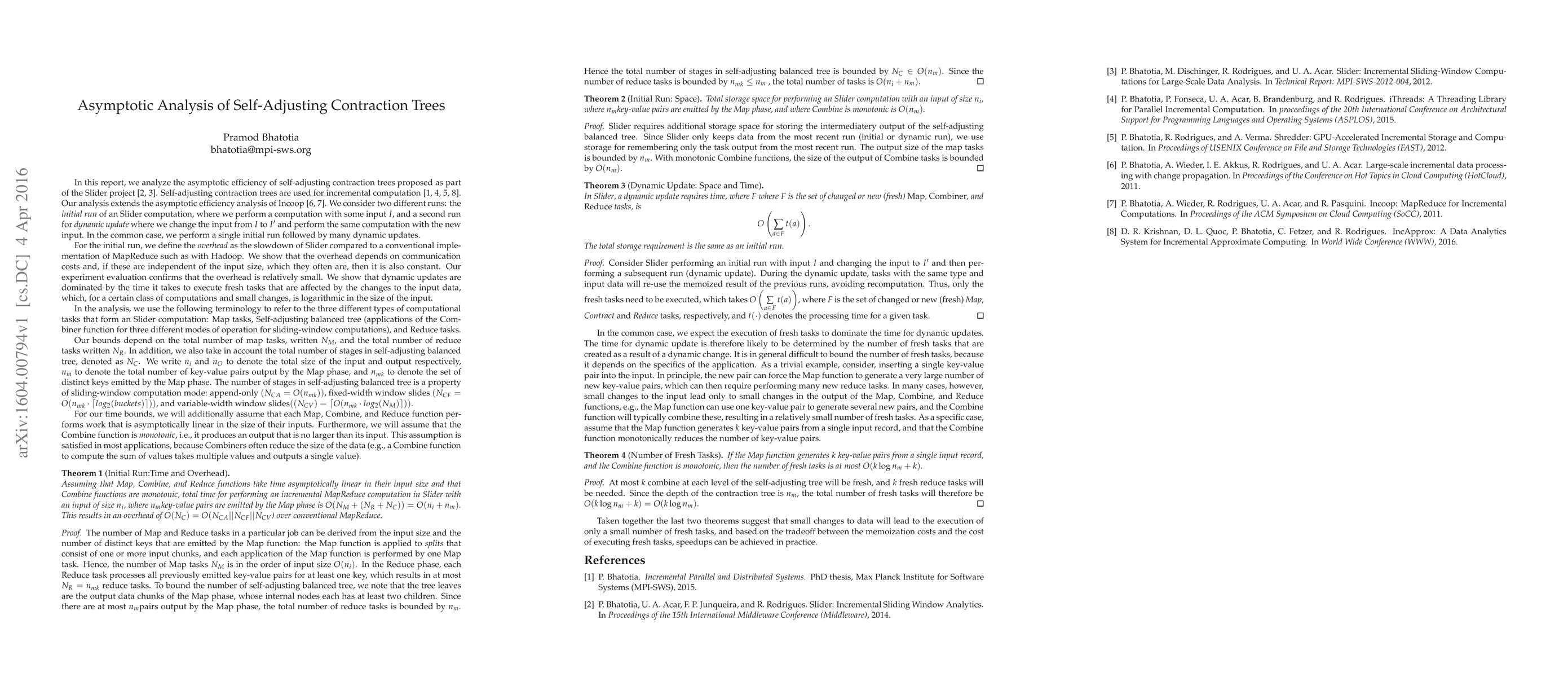 In this paper, we present asymptotic analysis of self-adjusting contraction trees for incremental sliding window analytics.