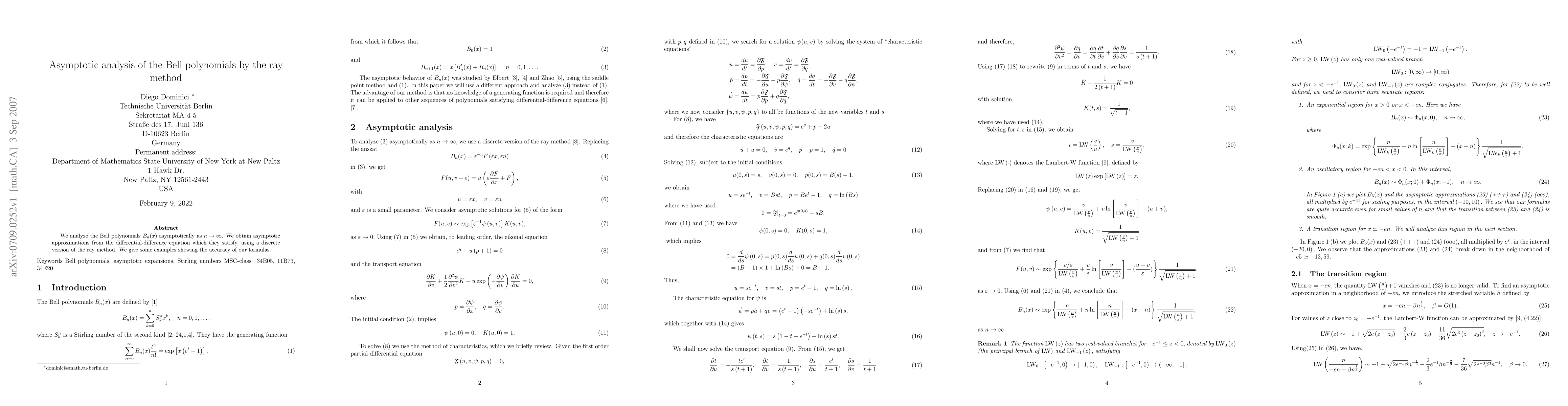 We analyze the Bell polynomials $B_{n}(x)$ asymptotically as $n\to\infty$. We obtain asymptotic approximations from the differential-difference equation which they satisfy, using a discrete version of the ray method. We give some examples showing the accuracy of our formulas.