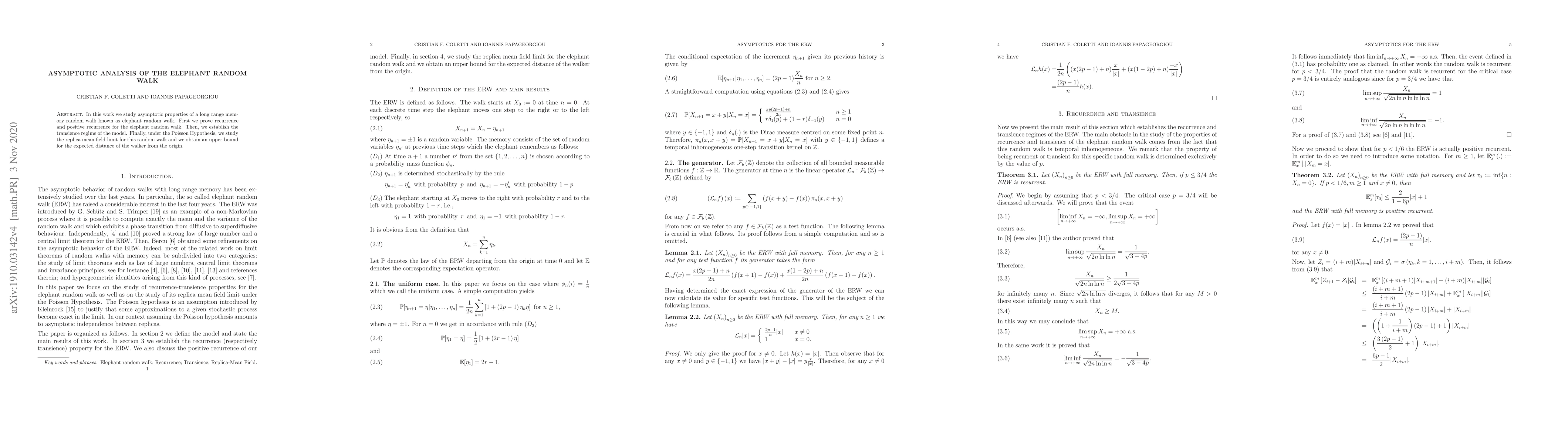 This paper investigates the asymptotic behavior of the elephant random walk, proving its recurrence and positive recurrence, establishing its transience regime, and deriving an upper bound for the expected distance of the walker from the origin under the Poisson Hypothesis.