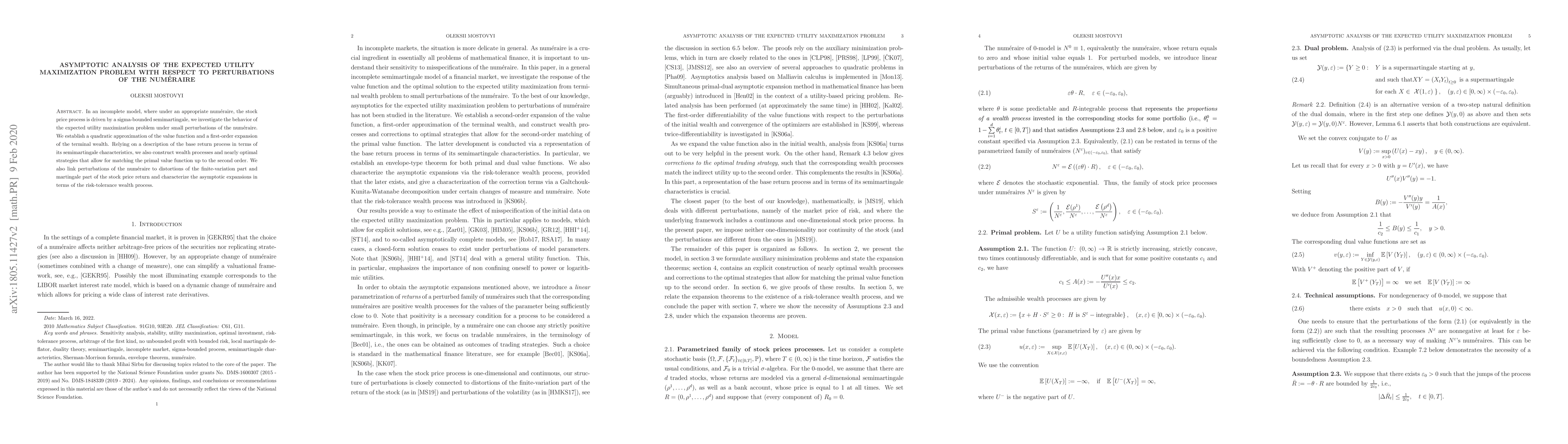In an incomplete model, where under an appropriate num\'eraire, the stock price process is driven by a sigma-bounded semimartingale, we investigate the behavior of the expected utility maximization problem under small perturbations of the num\'eraire. We establish a quadratic approximation of the value function and a first-order expansion of the terminal wealth. Relying on a description of the base return process in terms of its semimartingale characteristics, we also construct wealth processes and nearly optimal strategies that allow for matching the primal value function up to the second order. We also link perturbations of the num\'eraire to distortions of the finite-variation part and martingale part of the stock price return and characterize the asymptotic expansions in terms of the risk-tolerance wealth process.