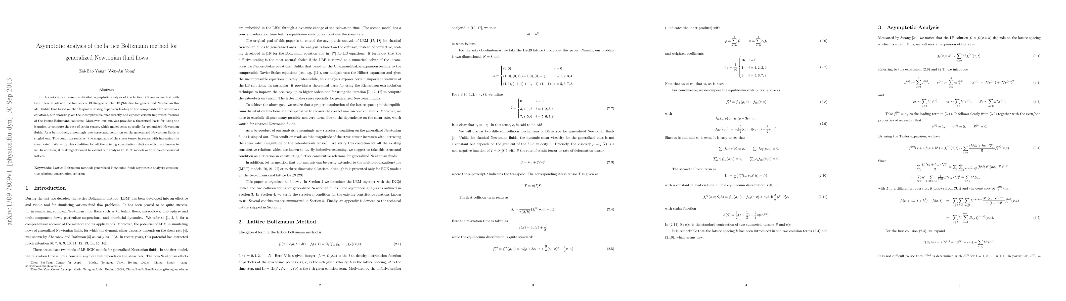 This paper conducts an asymptotic analysis of the lattice Boltzmann method for generalized Newtonian fluids, revealing features of the method that yield incompressible Navier-Stokes equations directly. It introduces a new structural condition for these fluids and extends the analysis to MRT models and three-dimensional lattices.