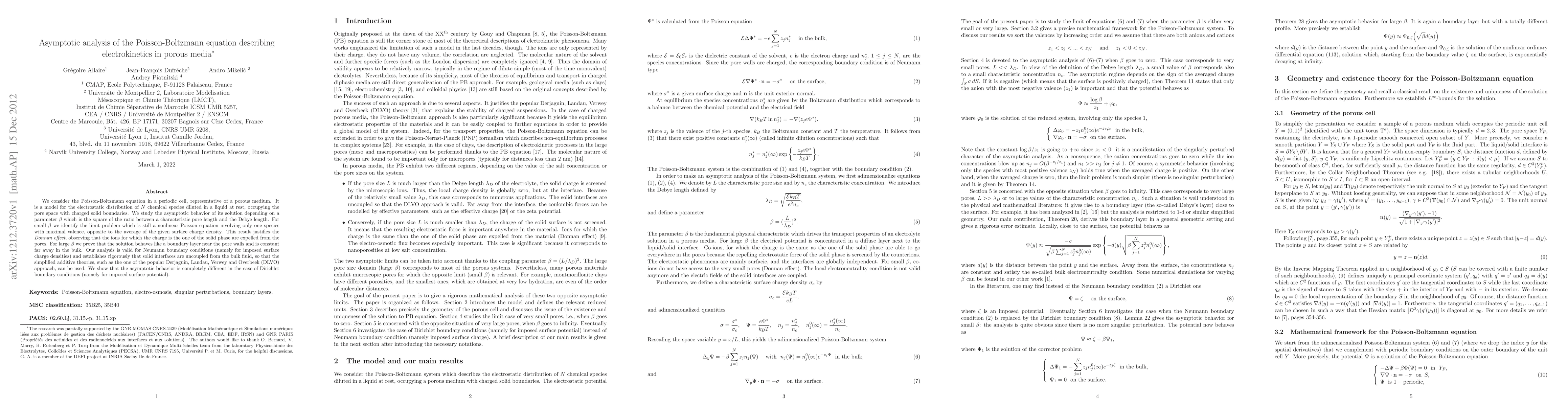 Researchers analyzed the behavior of electrokinetics in porous media using the Poisson-Boltzmann equation, finding that for small distances between pore length and Debye length, the solution behaves like a single-species nonlinear Poisson equation, while for large distances, it acts like a boundary layer near the walls and is constant far from the bulk.
