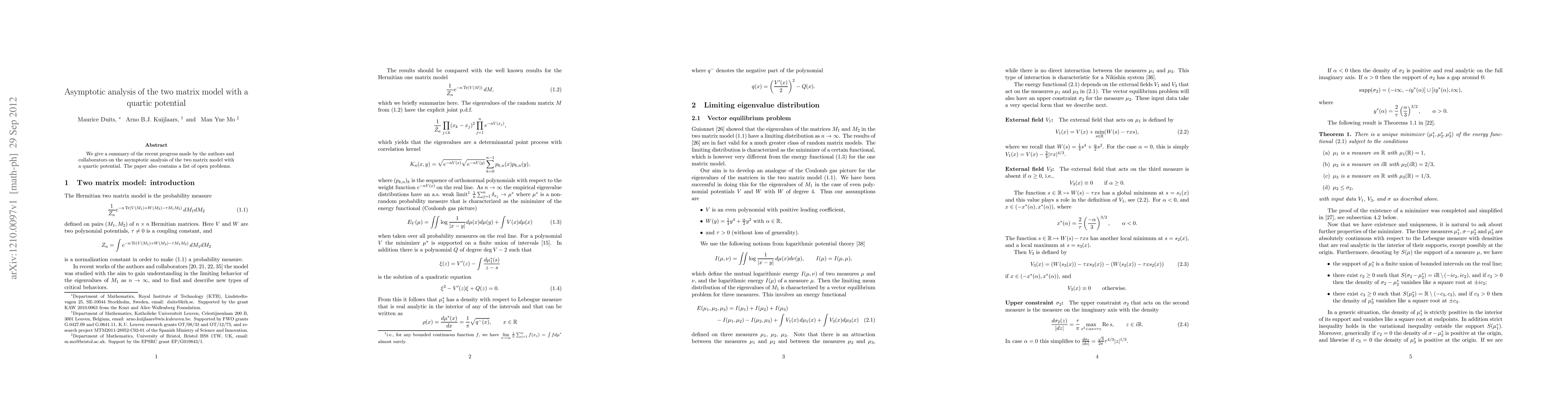 We give a summary of the recent progress made by the authors and collaborators on the asymptotic analysis of the two matrix model with a quartic potential. The paper also contains a list of open problems.