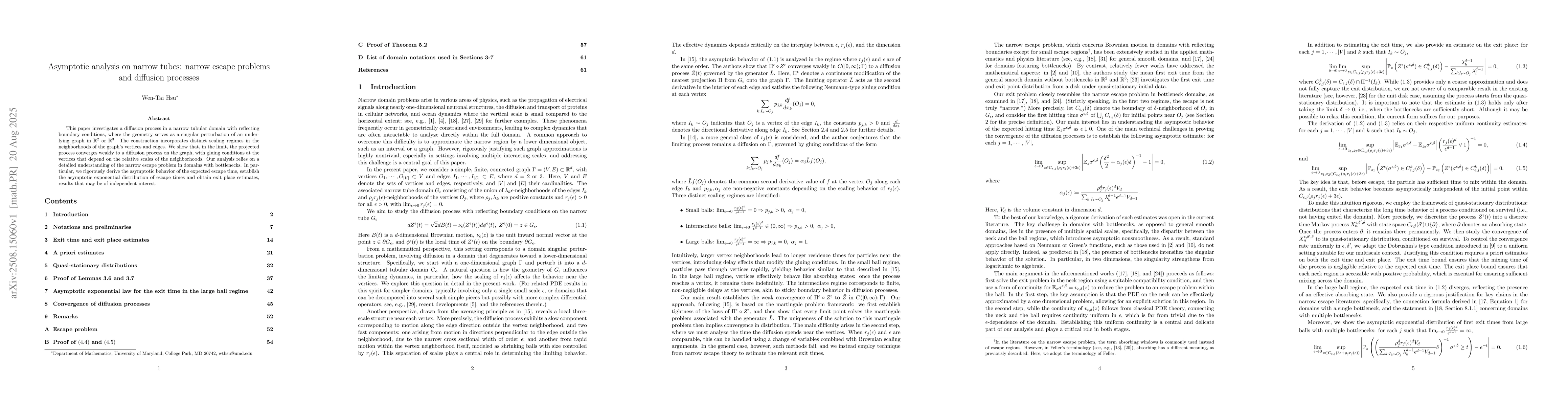 This paper investigates a diffusion process in a narrow tubular domain with reflecting boundary conditions, where the geometry serves as a singular perturbation of an underlying graph in $\mathbb{R}^2$ or $\mathbb{R}^3$. The construction incorporates distinct scaling regimes in the neighborhoods of the graph's vertices and edges. We show that, in the limit, the projected process converges weakly to a diffusion process on the graph, with gluing conditions at the vertices that depend on the relative scales of the neighborhoods. Our analysis relies on a detailed understanding of the narrow escape problem in domains with bottlenecks. In particular, we rigorously derive the asymptotic behavior of the expected escape time, establish the asymptotic exponential distribution of escape times and obtain exit place estimates, results that may be of independent interest.