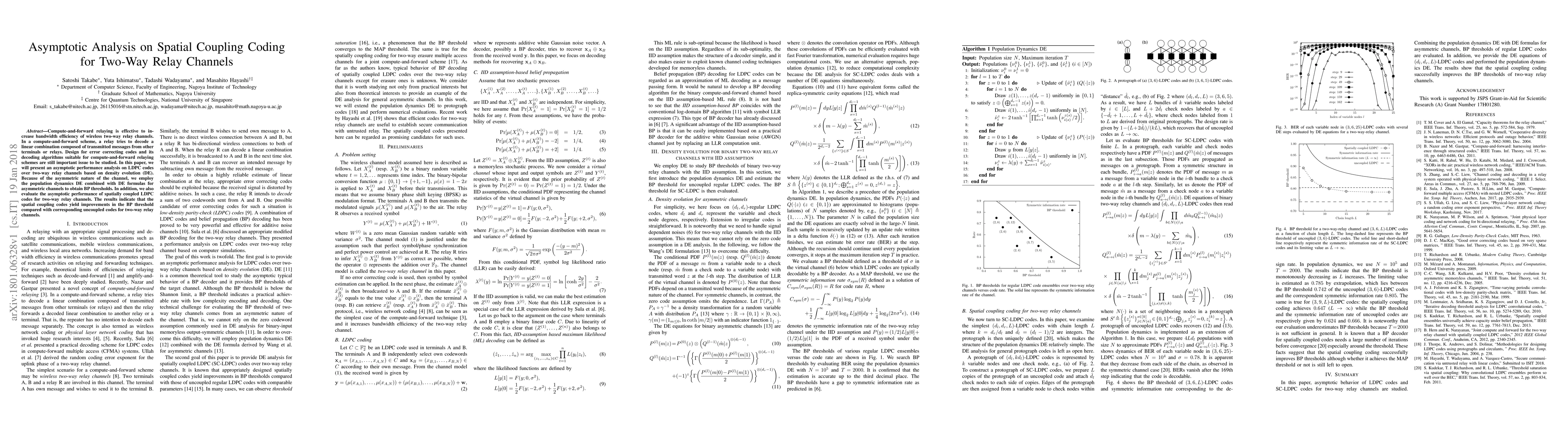 Compute-and-forward relaying is effective to increase bandwidth efficiency of wireless two-way relay channels. In a compute-and-forward scheme, a relay tries to decode a linear combination composed of transmitted messages from other terminals or relays. Design for error correcting codes and its decoding algorithms suitable for compute-and-forward relaying schemes are still important issue to be studied. In this paper, we will present an asymptotic performance analysis on LDPC codes over two-way relay channels based on density evolution (DE). Because of the asymmetric nature of the channel, we employ the population dynamics DE combined with DE formulas for asymmetric channels to obtain BP thresholds. In addition, we also evaluate the asymptotic performance of spatially coupled LDPC codes for two-way relay channels. The results indicate that the spatial coupling codes yield improvements in the BP threshold compared with corresponding uncoupled codes for two-way relay channels.